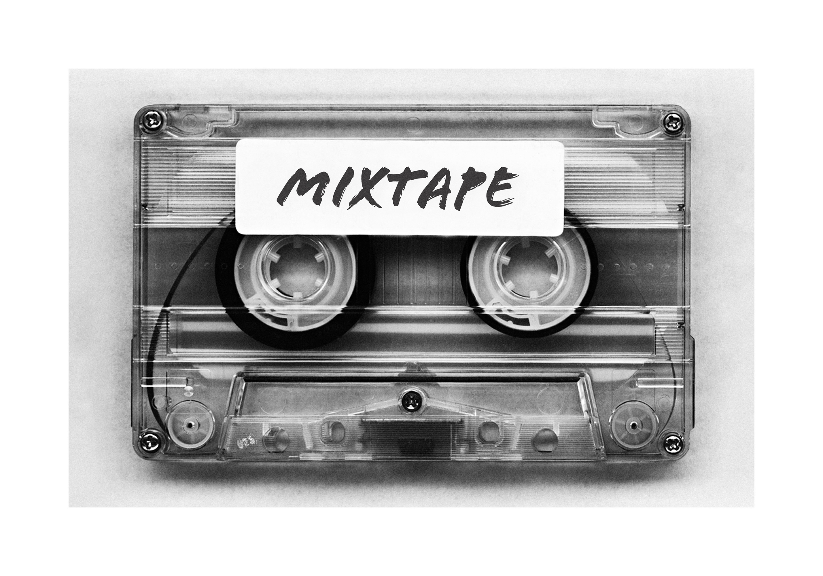 A black and white print of a clear cassette tape with the word "MIXTAPE" on the label. Perfect retro wall art for music lovers!