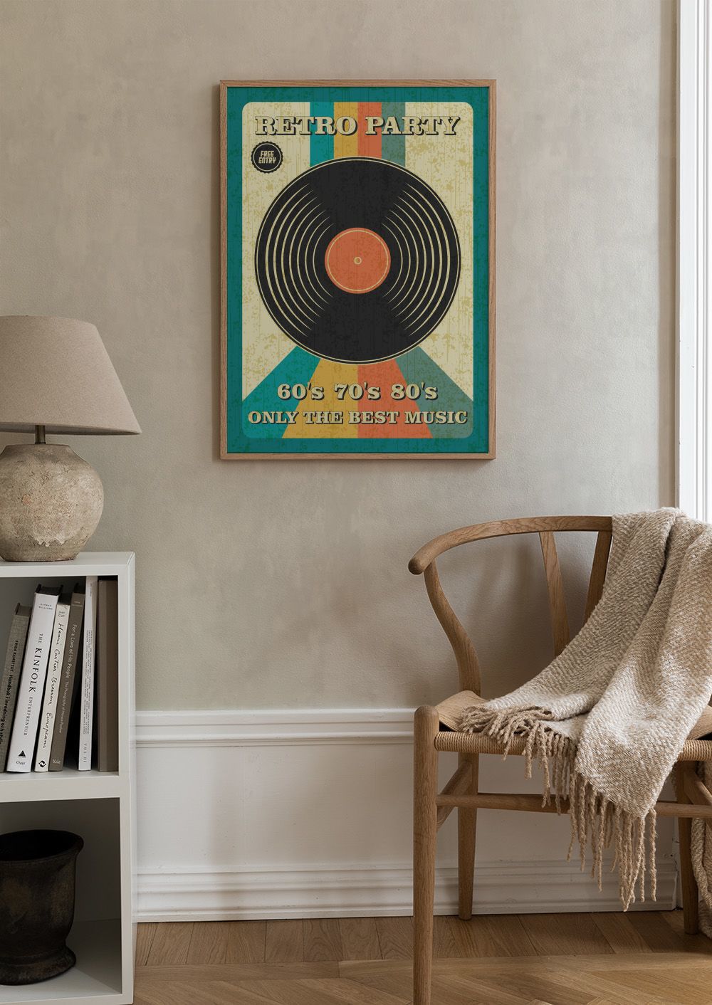 A retro print with a black vinyl record in the centre and colourful stripes in teal, orange, red, and beige. Perfect wall art for music lovers!