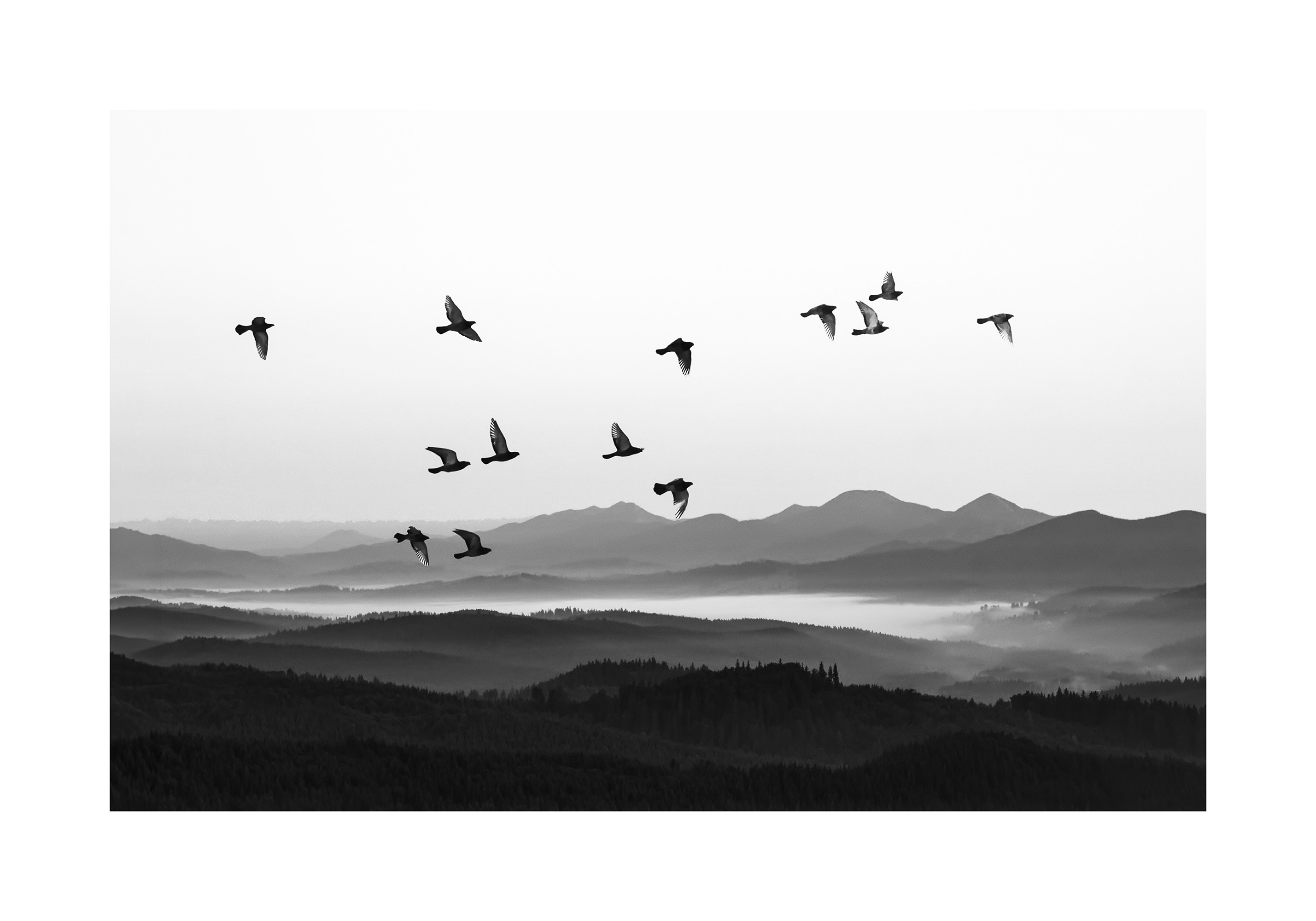 A black and white print of birds flying over misty hills and mountains. The birds are silhouetted against a bright sky, creating calm and serene wall art for your home.