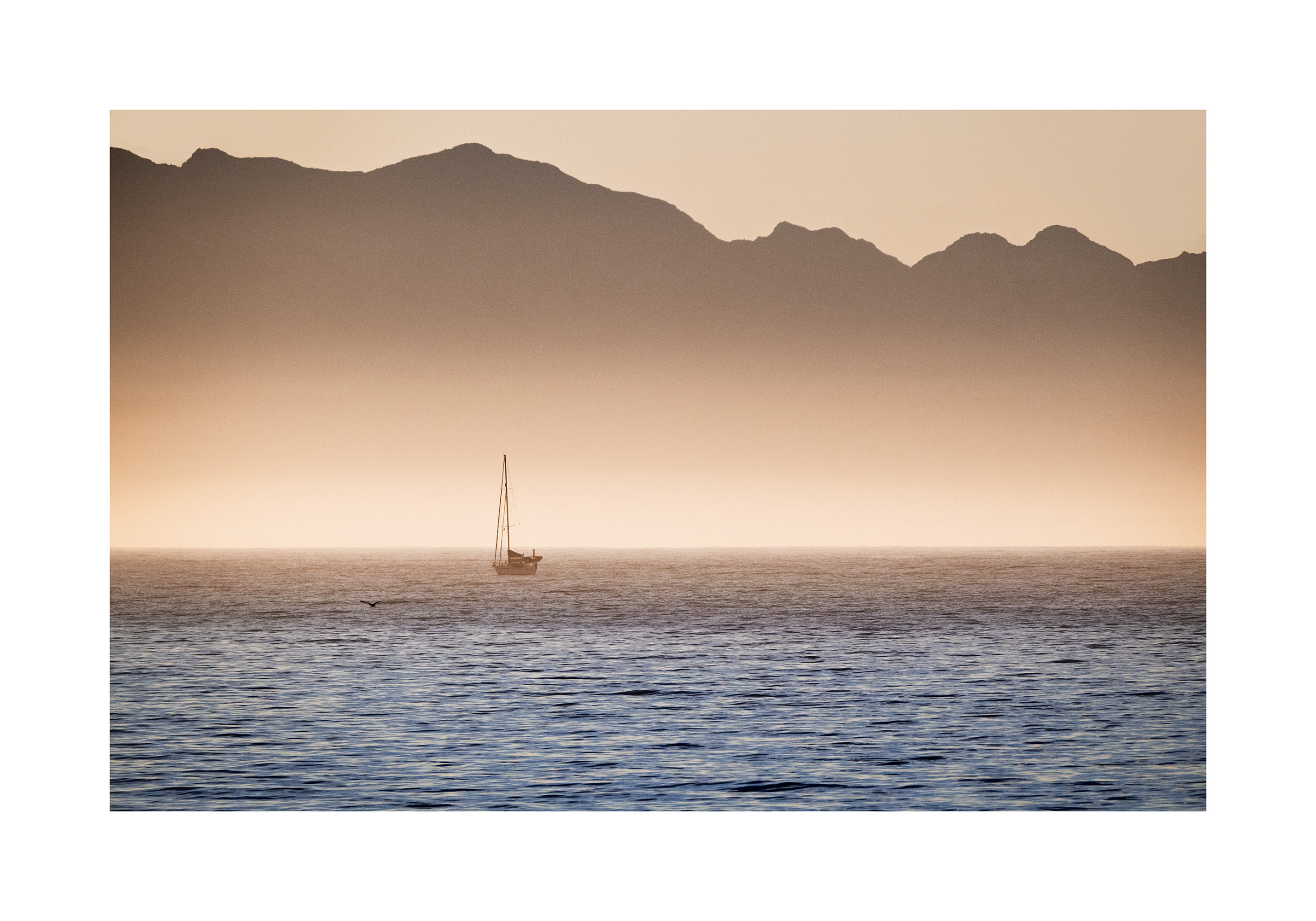 A print of a small sailboat floating on calm blue water with misty mountains in the background.
