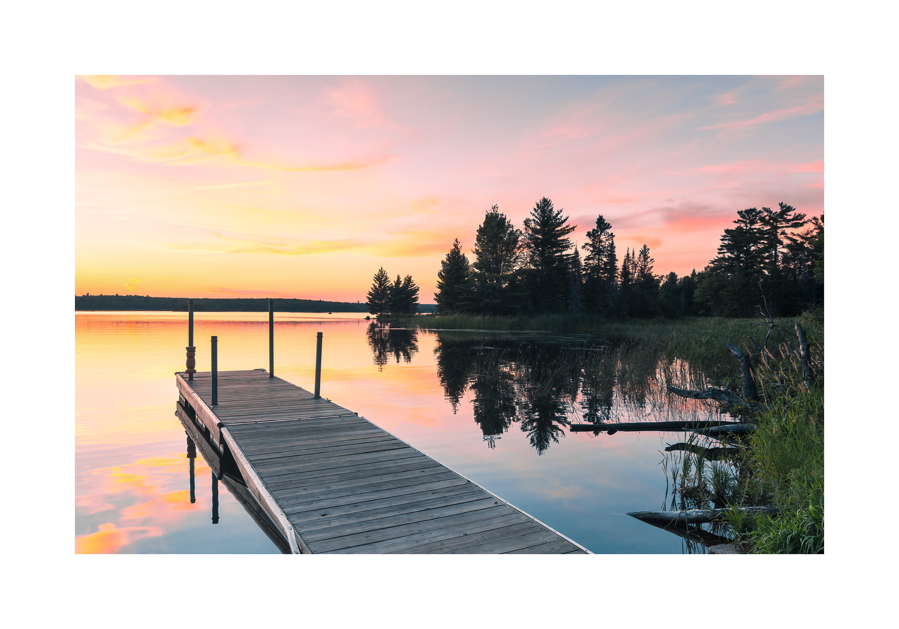 A print of a wooden dock stretching over calm water at sunset. The sky glows in pink, orange, and yellow tones, with trees reflecting in the water.