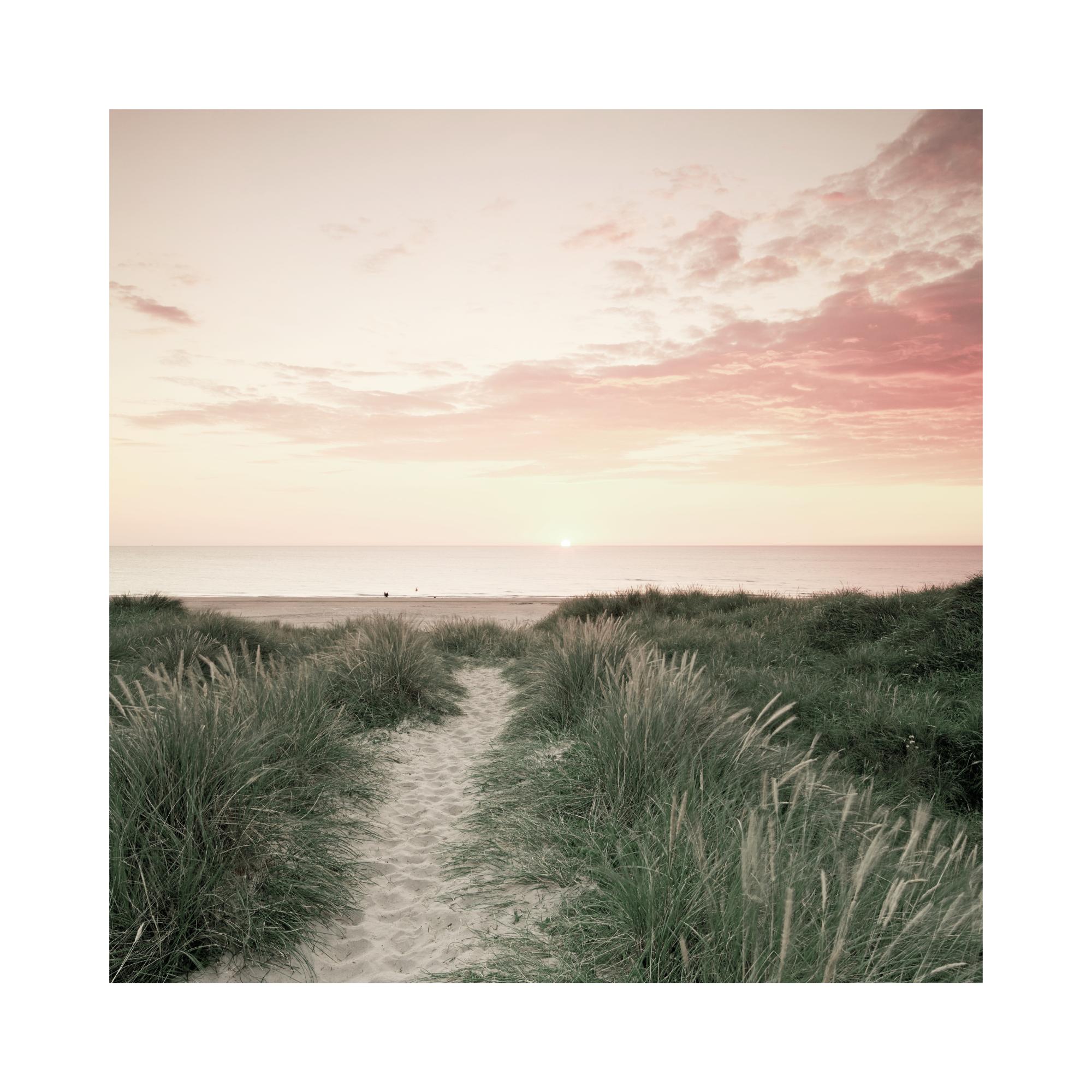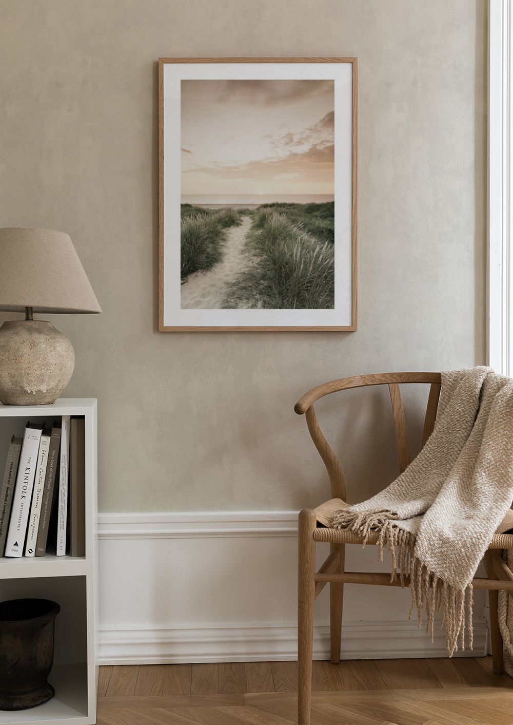 A beautiful landscape poster of a path that leads directly through the dunes to the sea. The warm light of the sunrise gives the poster a calming atmosphere and puts us in a special mood. The poster has a printed white margin that frames the design.