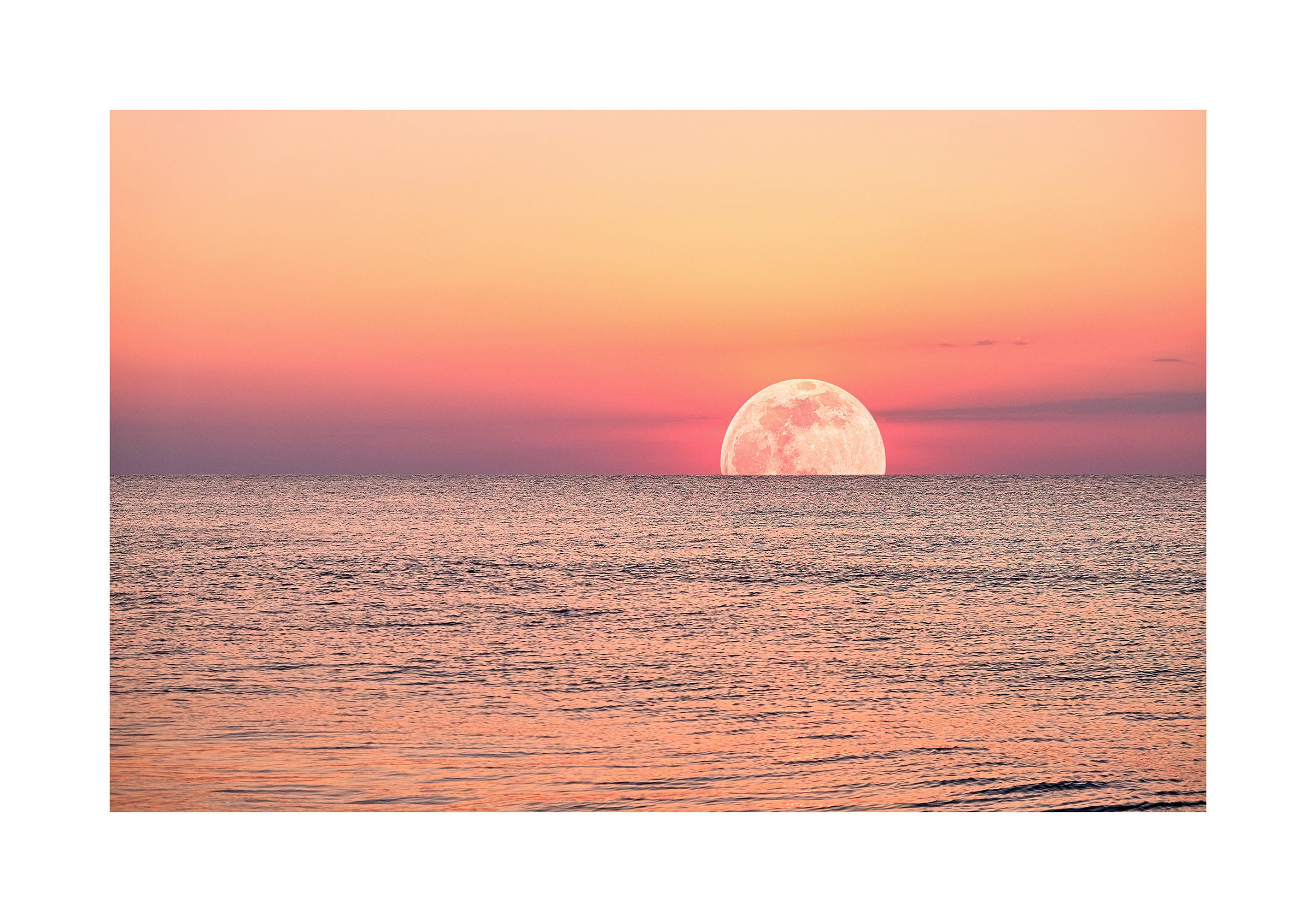 A print of a bright moon over a calm sea with a sky in soft pink, orange, and light purple. The water reflects the pastel colours, creating a peaceful and dreamy scene.