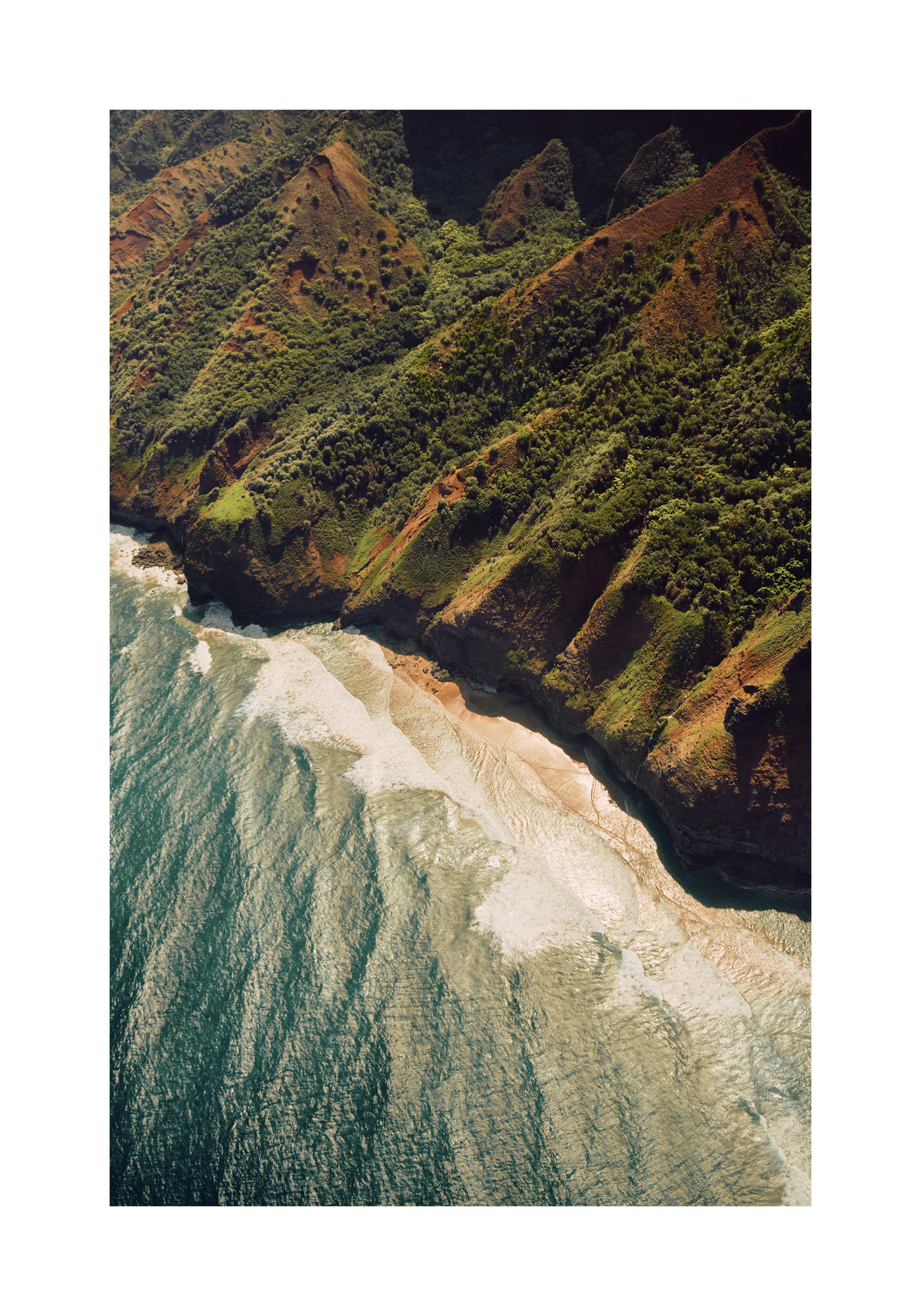 A stunning print of the Na Pali Coast with blue ocean waves, sandy beach, and tall green cliffs under bright sunlight.