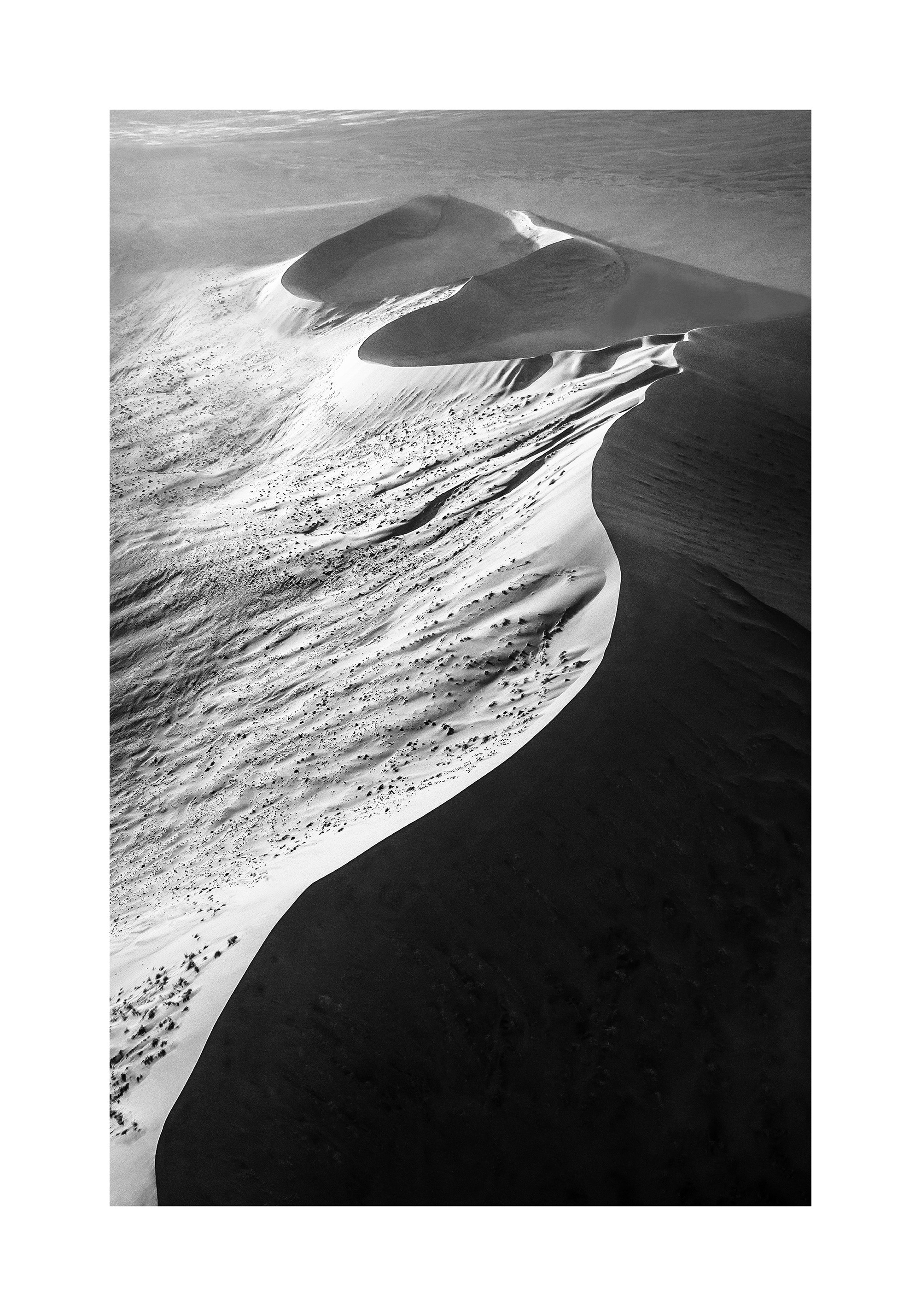 A black and white print of sand dunes with smooth, curved shapes. Light sand on the left contrasts with dark shadows on the right, creating a striking desert scene.