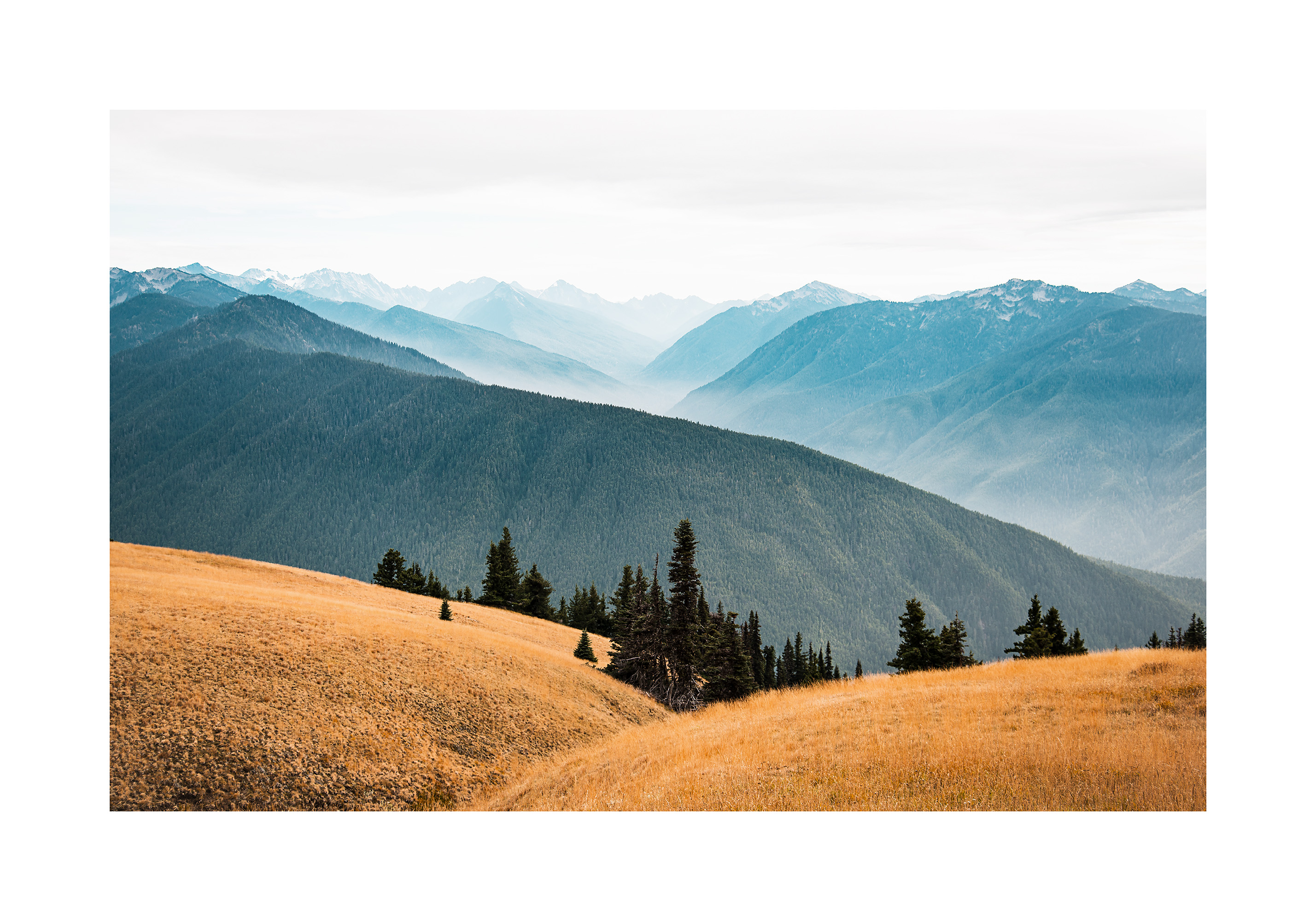 A print of rolling hills with golden grass and dark green pine trees. In the background, layers of blue mountains fade into the distance under an overcast sky.