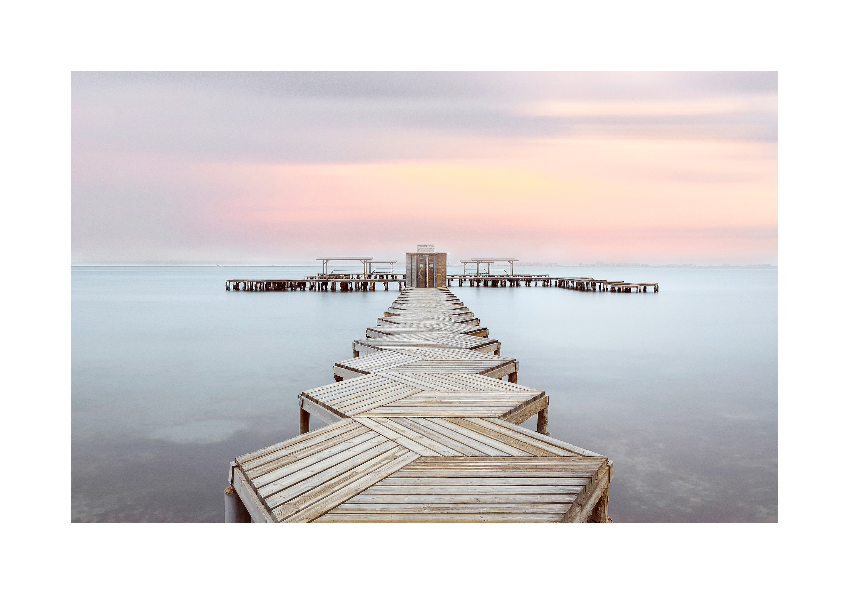 A print of a wooden pier stretching over calm, light blue water. The pier has a zigzag pattern and leads to a small structure. The sky is soft pink and peach, creating a peaceful scene.
