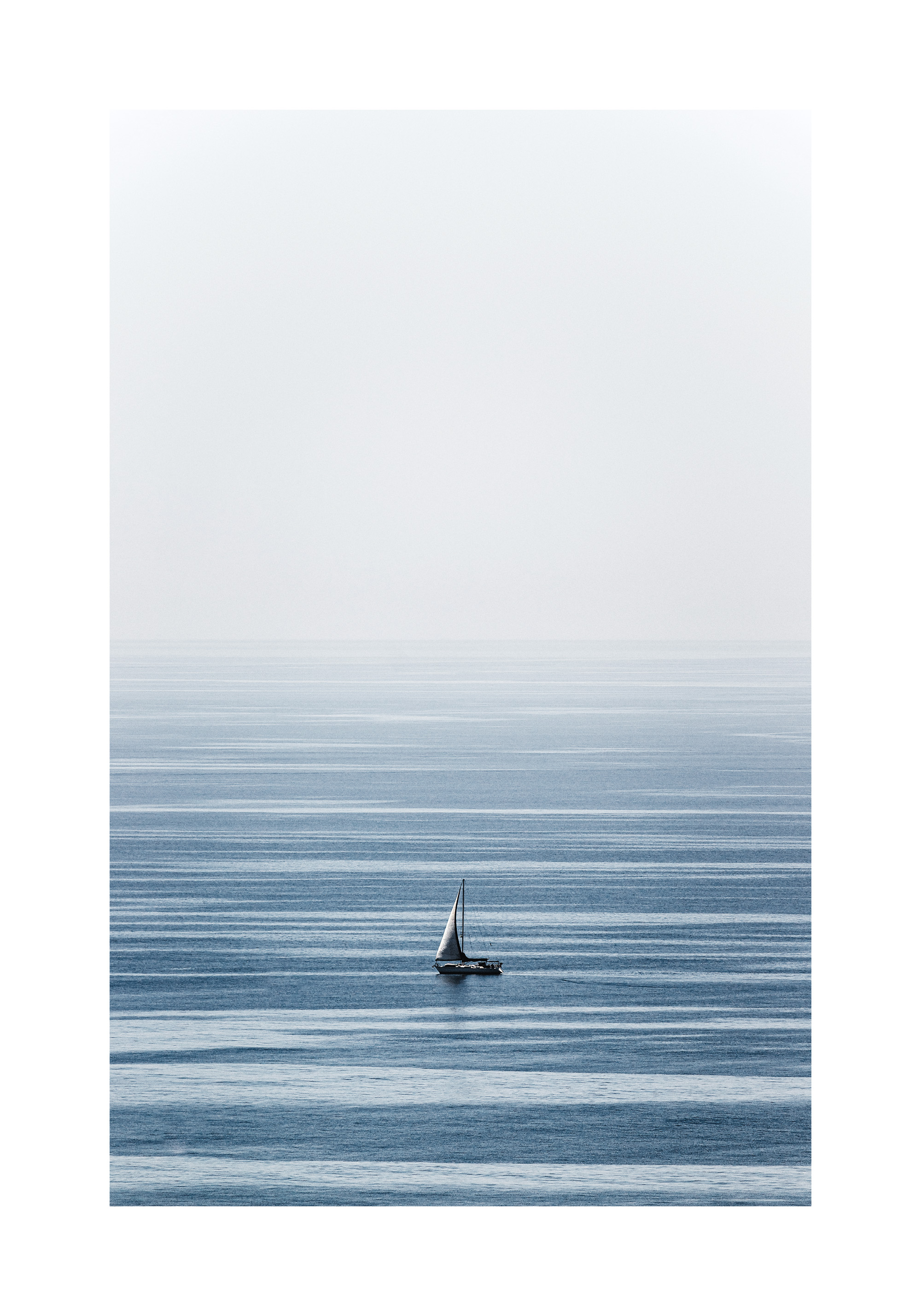 A print of a small sailboat with white sails on a calm blue sea. Perfect wall art for creating a peaceful atmosphere in your home.