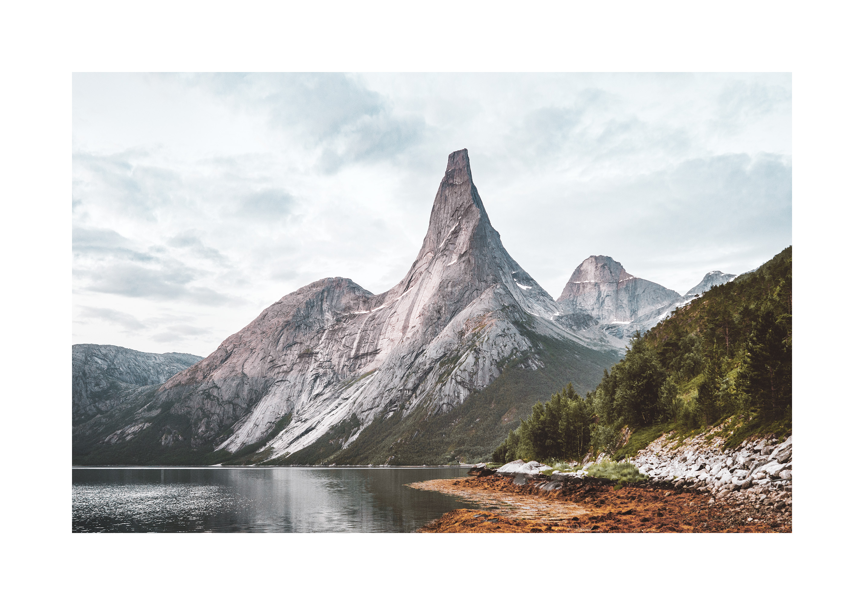 A print of a tall, pointed mountain rising against a cloudy sky. The rocky mountain in grey and brown tones is reflected in the calm lake below. Perfect wall art for nature lovers.