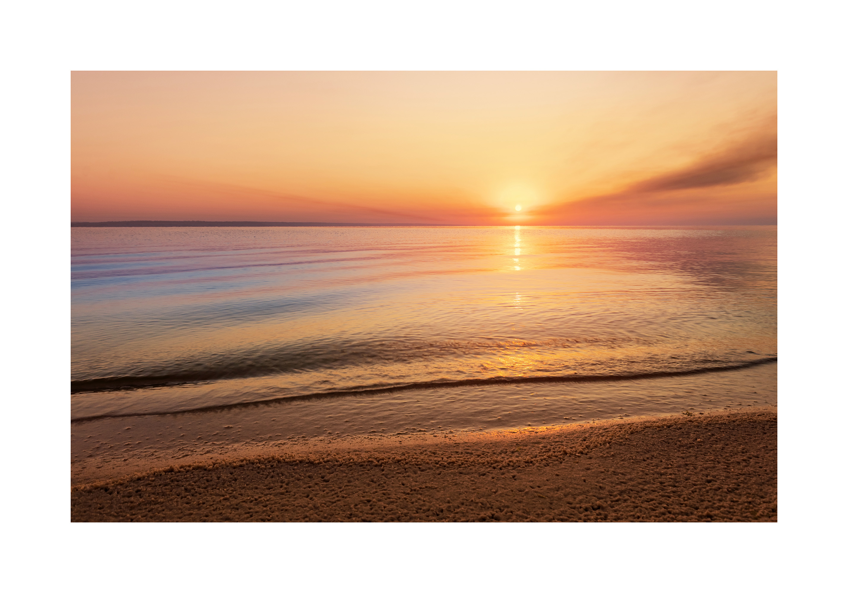 A print of a calm beach with gentle waves and a beautiful sunset. The sky is orange and pink, and the water reflects the warm colours.