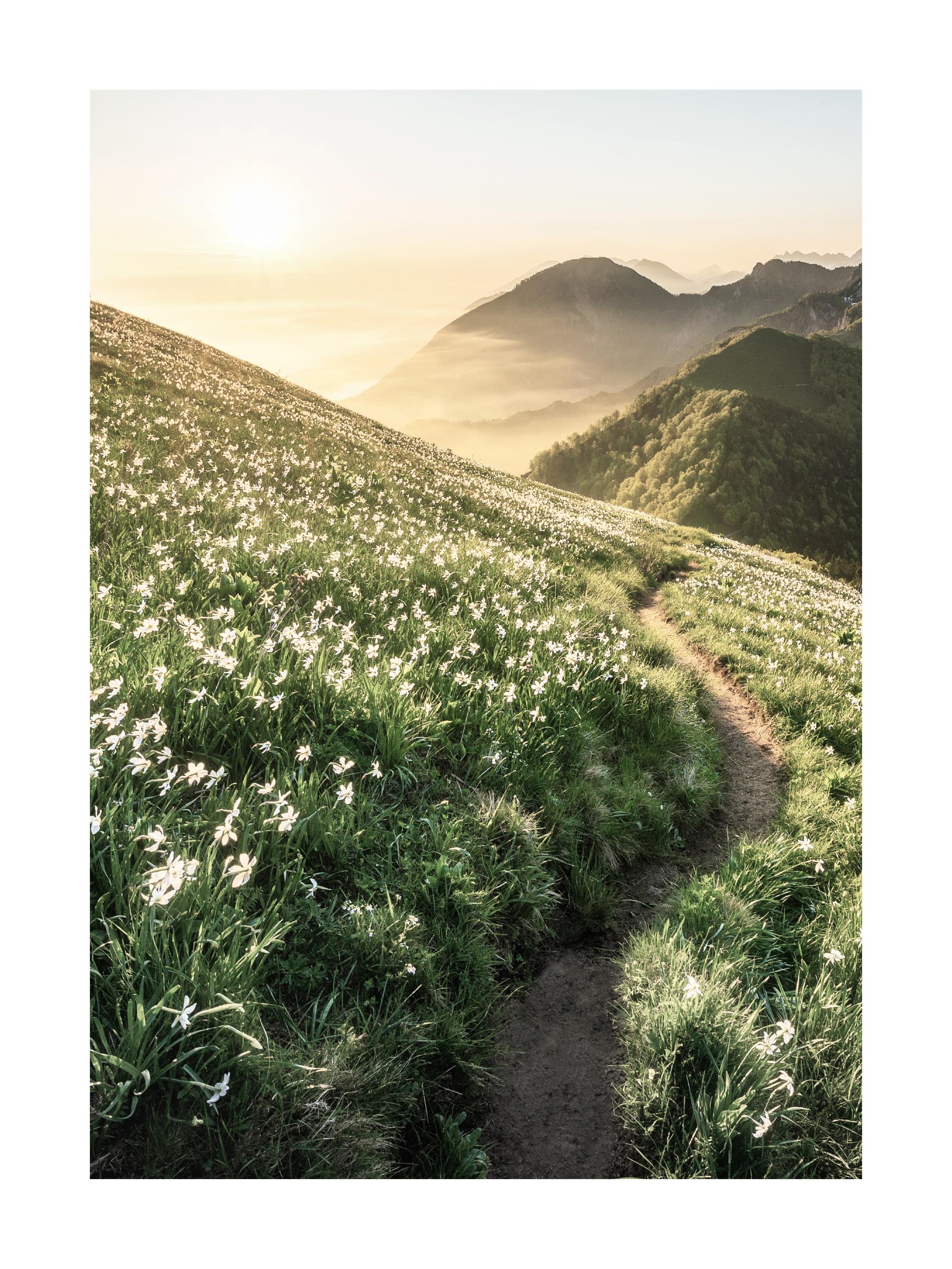 From $18.17A beautiful nature print of a path that leads along a mountain through a green meadow with white flowers. Feel the sunrays on your skin and breathe the mountain air. There is nothing more beautiful than hiking in the mountains while enjoying the nature and recharging your batteries.
