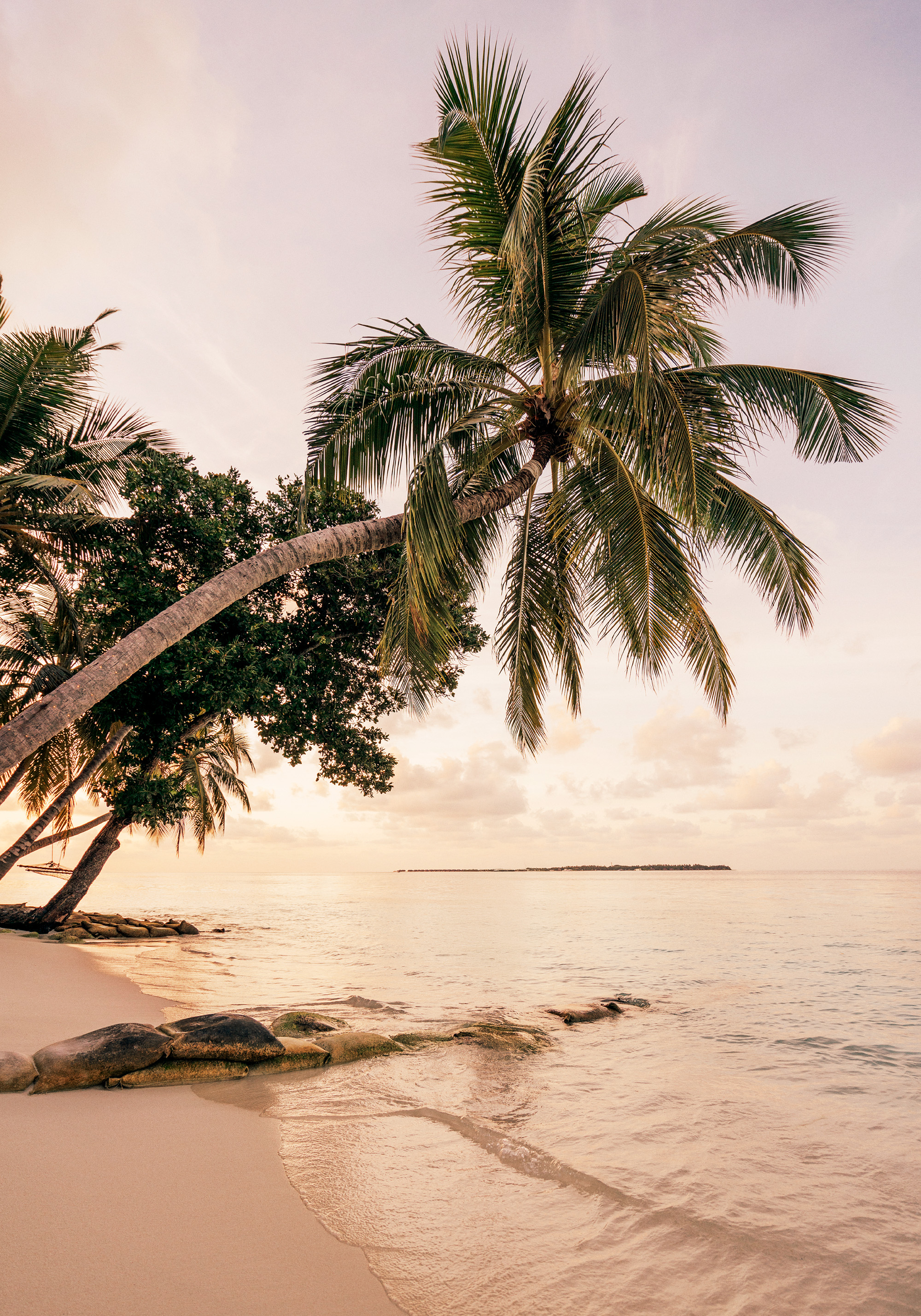 A print of palm trees leaning over a sandy beach with calm ocean waves and rocks at the water's edge. The sky is soft pink and orange, creating a peaceful tropical scene.
