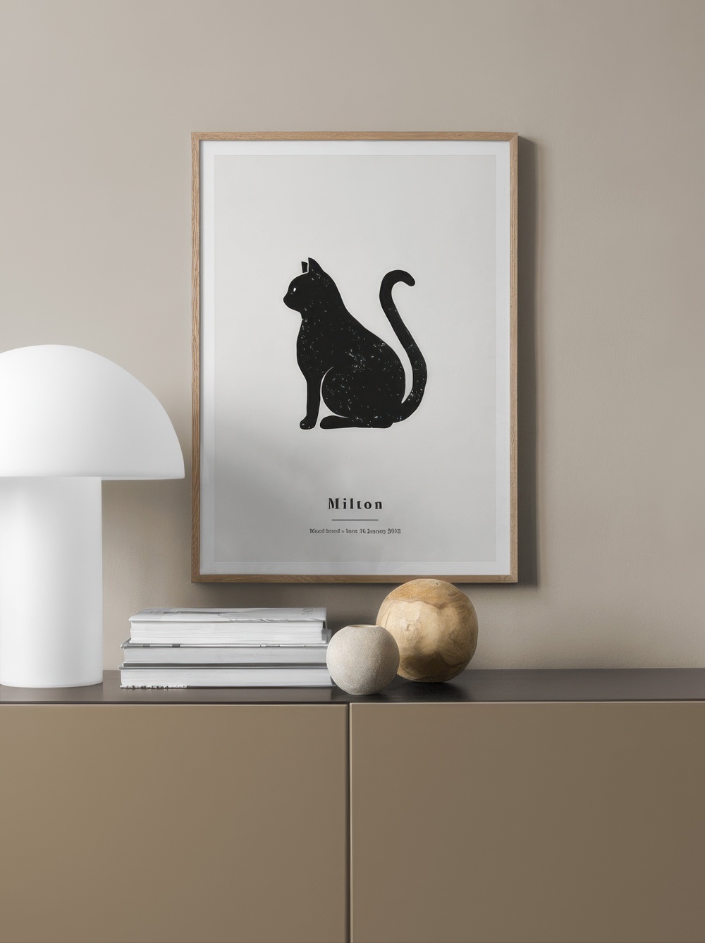 Illustration of a black cat with white spots, on a light grey background with text at the bottom. Personalized prints allow you to customise your very own print, either by adding your own text, names or dates. It's both a fun way to personalise your own art or to give as a gift to someone else.