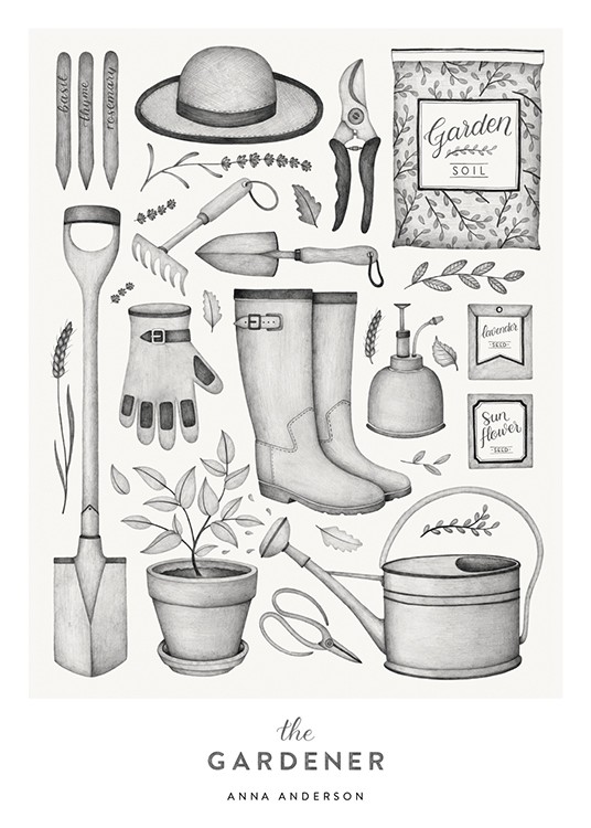 Illustration in grey-scale of gardening tools and text at the bottom. Personalized prints allow you to customise your very own print, either by adding your own text, names or dates. It's both a fun way to personalize your own art or to give as a gift to someone else.