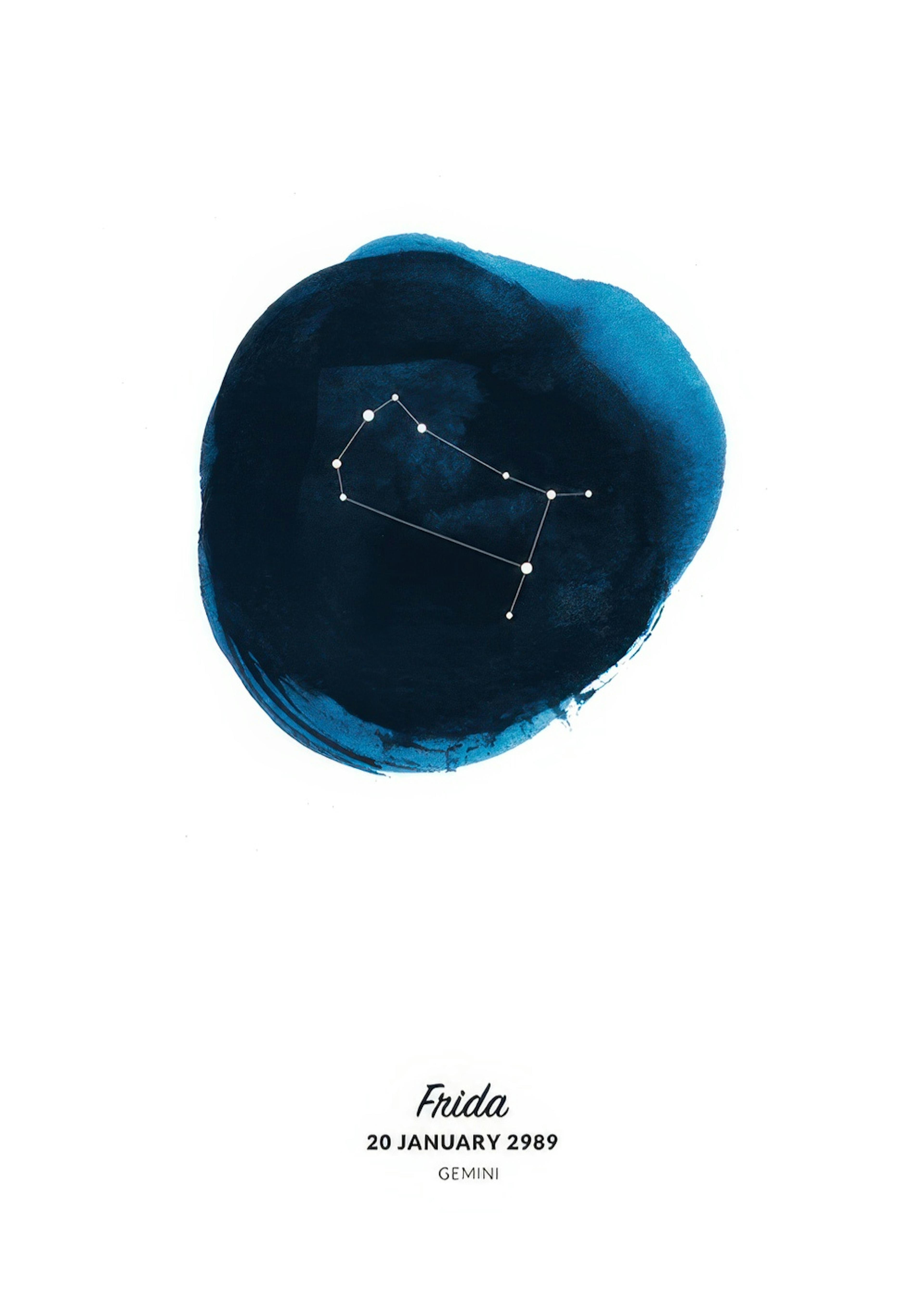 From $10.47- Illustration of the Gemini sign in a circle painted in blue watercolour