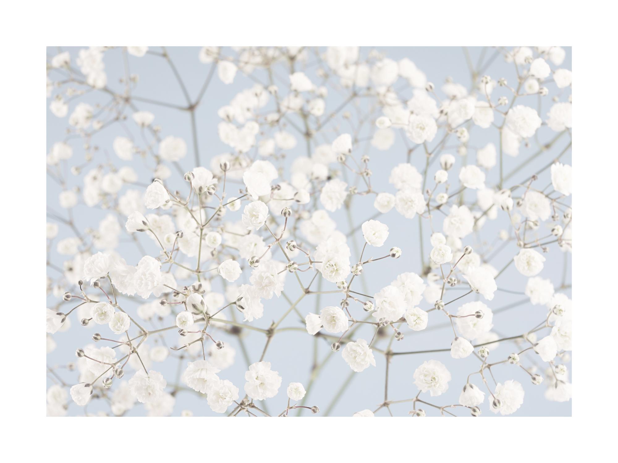Photograph of a print in a landscape depicting white flowers in the cloudy blue sky. Create a romantic feel in the bedroom or living room with this botanical wall art.