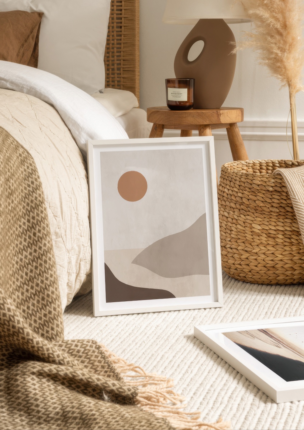 From $5.24print with an illustration of a landscape at dawn in beige colors. Create a serene environment in your home with landscape prints in calm colors. This art print has a texture in the background.