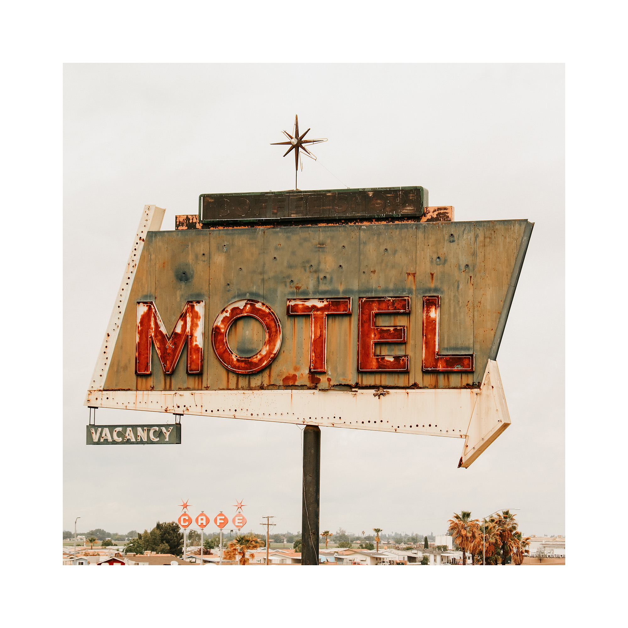 A print of a rusty motel sign with red letters and a green vacancy sign below. Perfect wall art for a retro vibe.