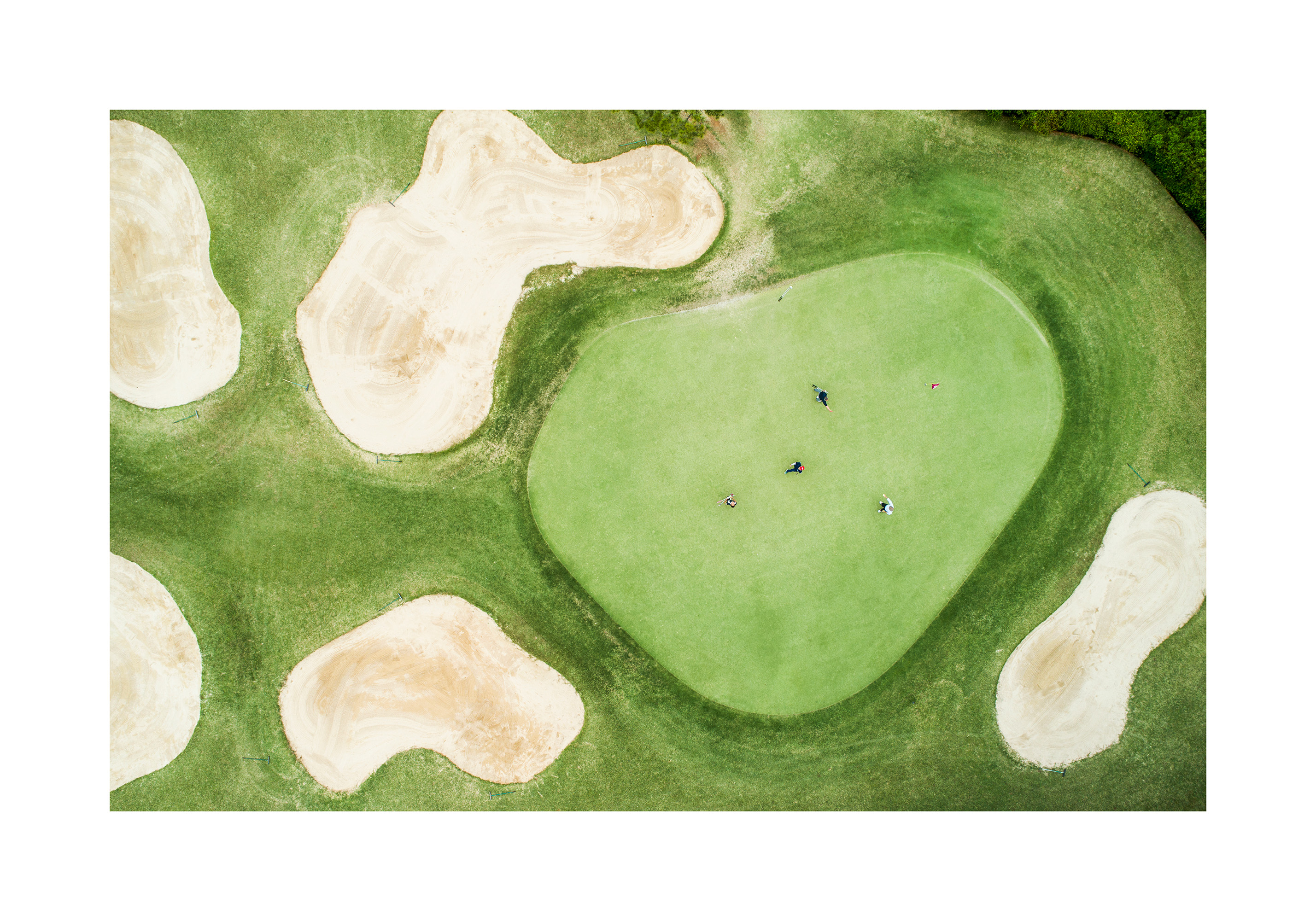 An aerial photo print of a golf course green with sandy patches surrounding it. Perfect wall art for golf lovers!