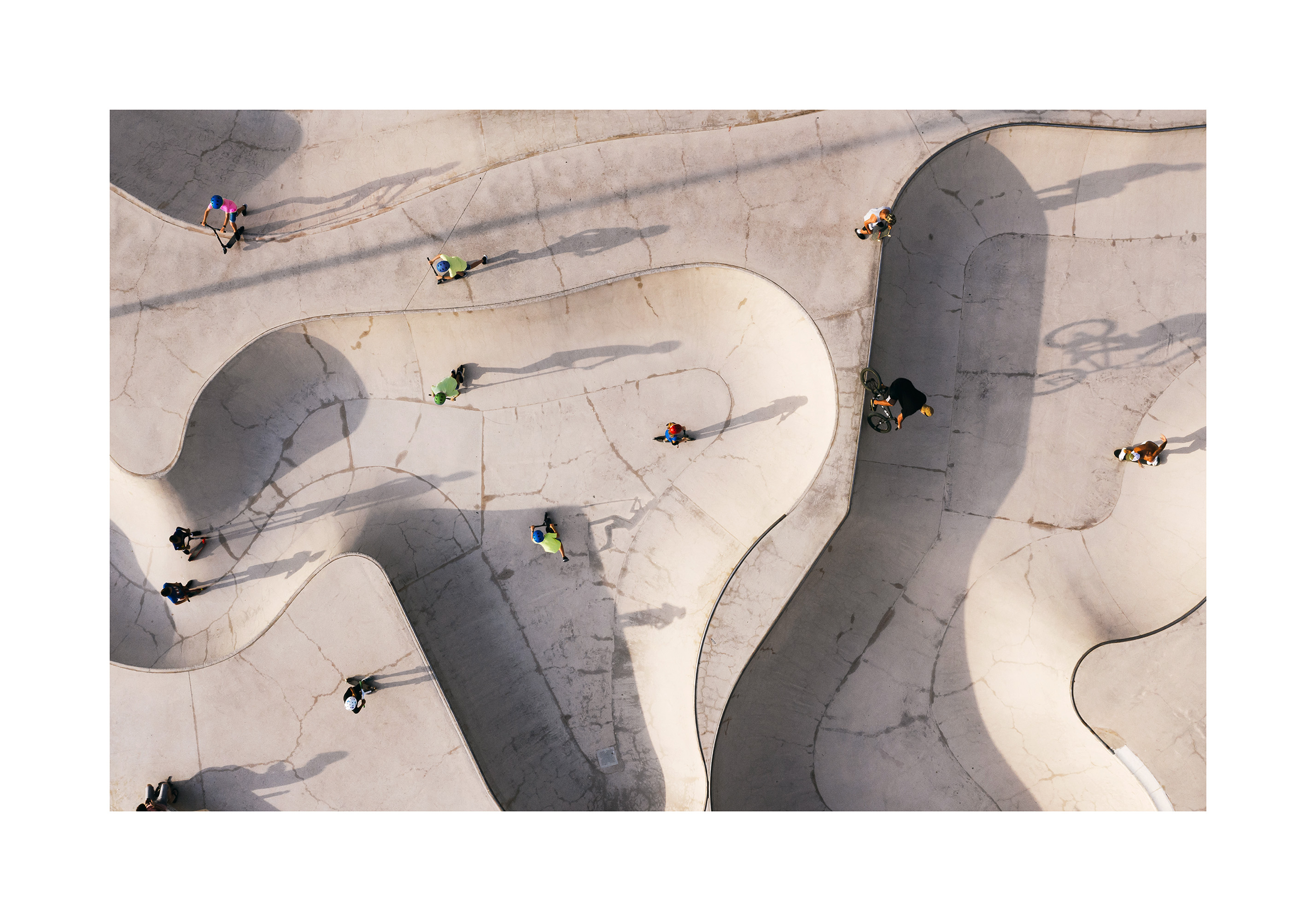 A photo print of a concrete skate park with curved ramps and bowls. People are scattered across the park, some walking and some riding bikes.