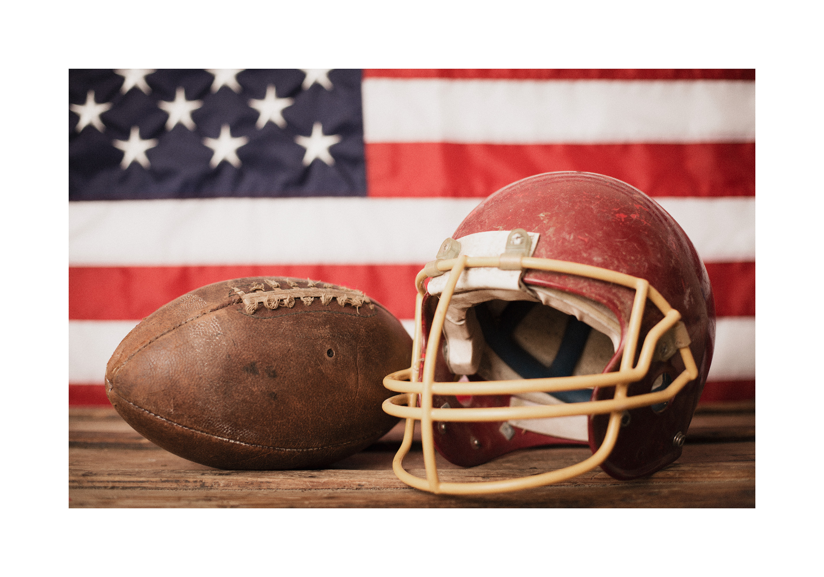 A print of an American football and a red helmet with a yellow face guard on a wooden surface, with a U.S. flag in the background. Perfect wall art for sports fans!