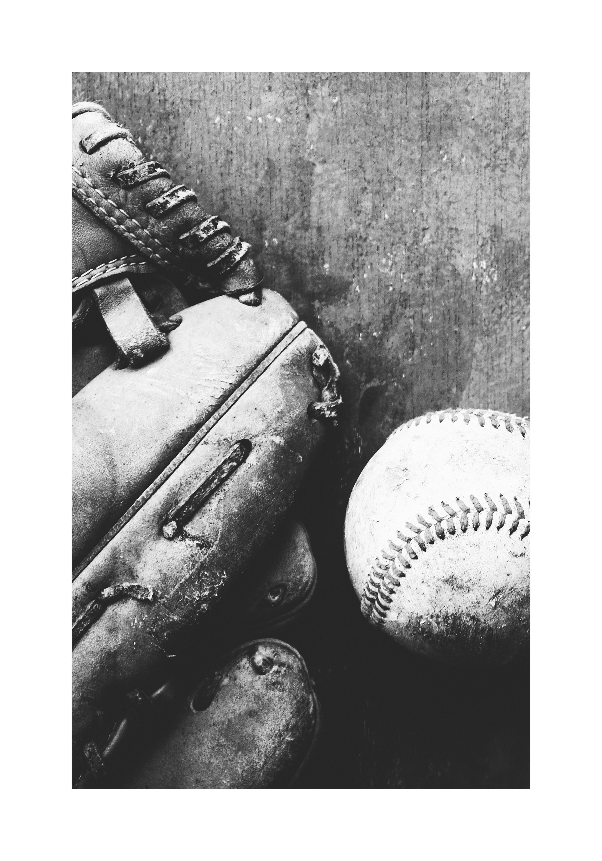 A black and white print of a worn baseball glove and a scuffed baseball. Perfect wall art for sports fans!