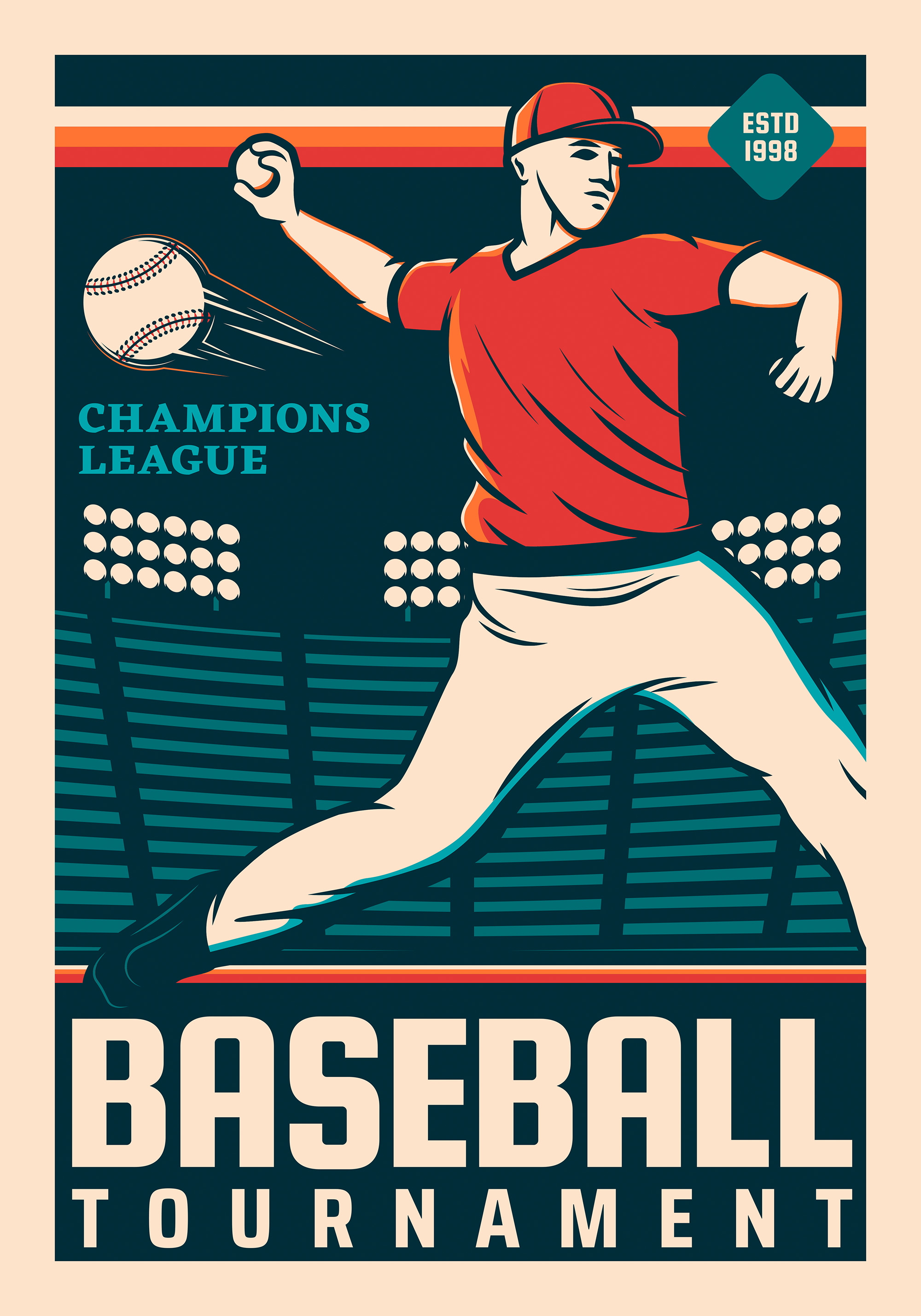 A retro sports print with a baseball player in a red shirt throwing a ball. Perfect wall art for baseball fans!