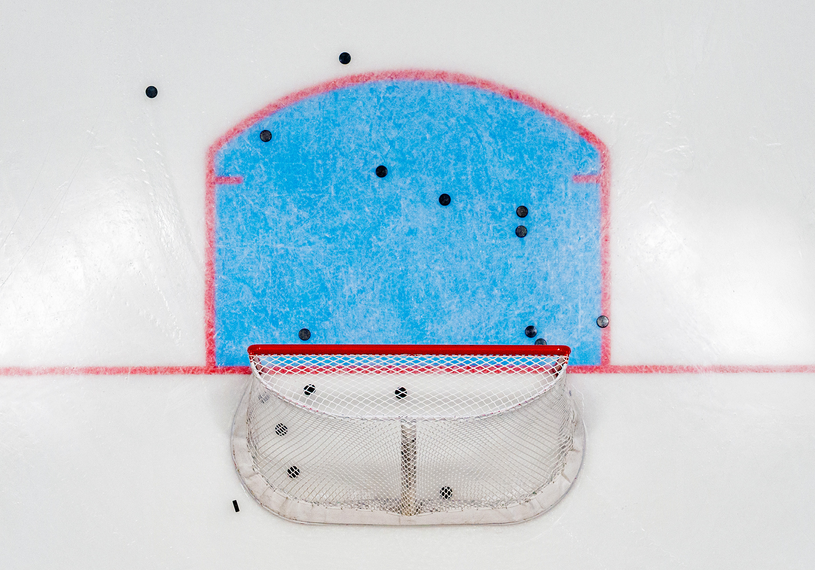 A print of a hockey goal on ice with a light blue semicircle outlined in red. Black hockey pucks are scattered on the ice and in the net. Perfect wall art for hockey fans!