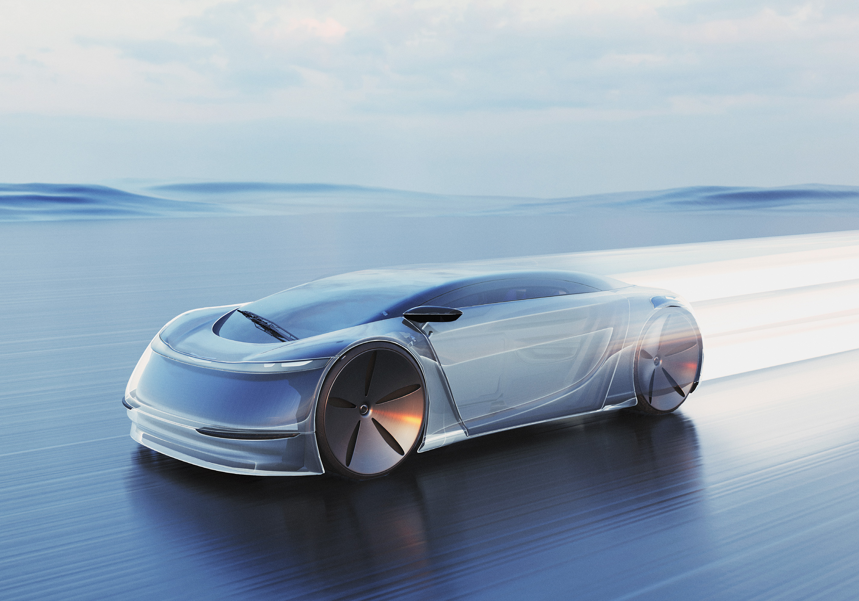 A print of a sleek, silver car with dark wheels on a smooth road. The blurred blue and white background creates a sense of speed.