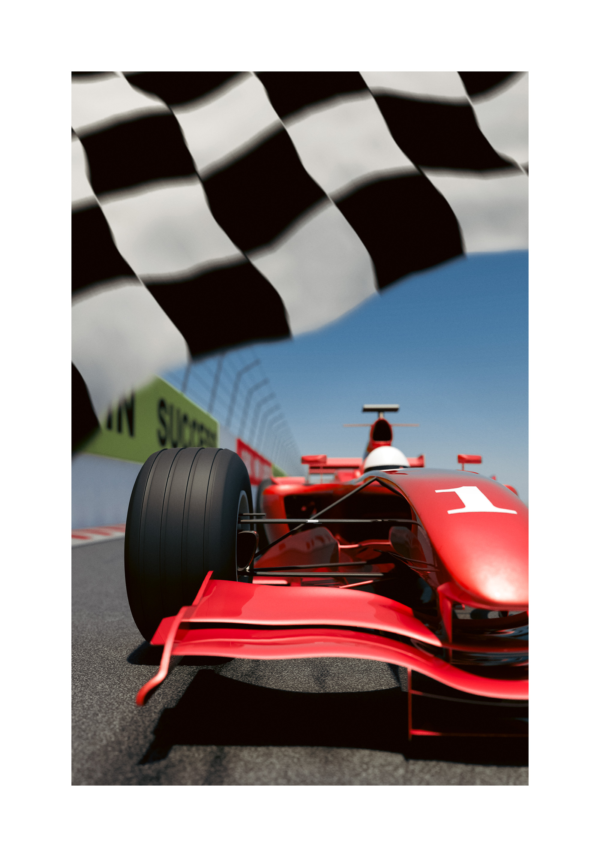 A print of a red race car with the number "1" on the front, racing towards the finish line with a checkered flag waving above it. Perfect wall art for racing fans!