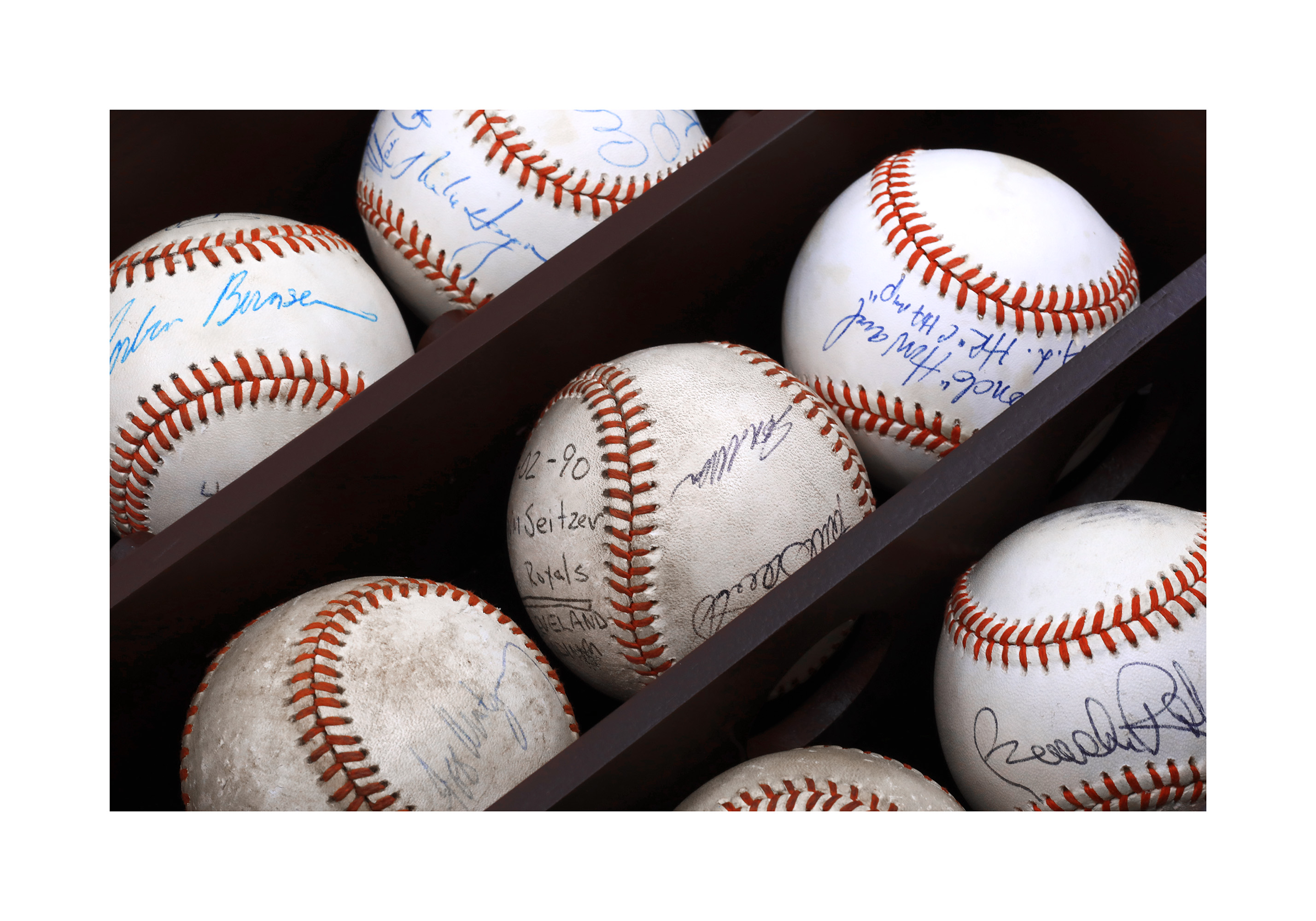 A print of signed baseballs with red stitching displayed in a wooden case. Perfect wall art for baseball fans!