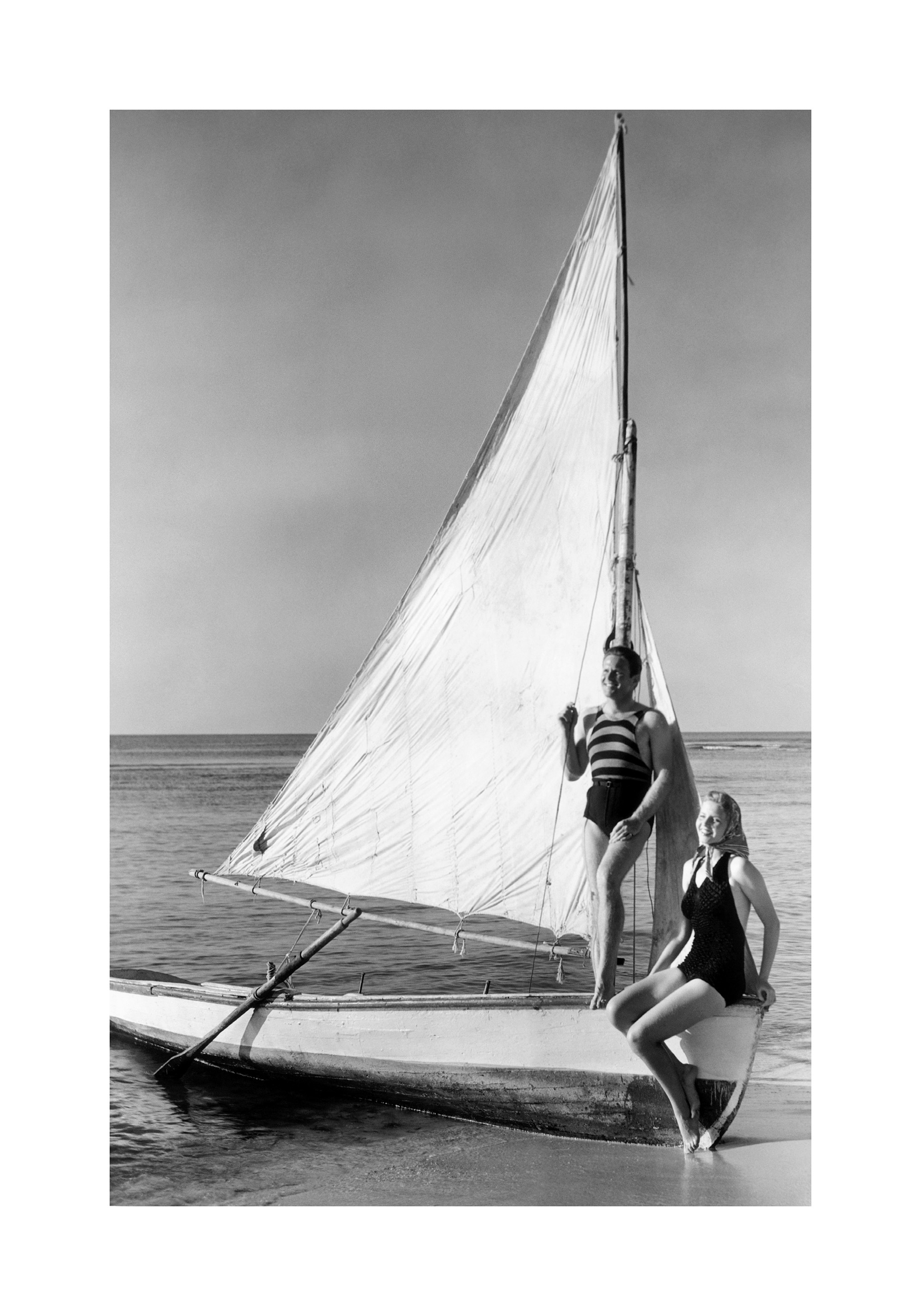 A black and white print of two people on a sailboat with a large triangular sail. The boat floats on calm water with a clear sky and horizon in the background.