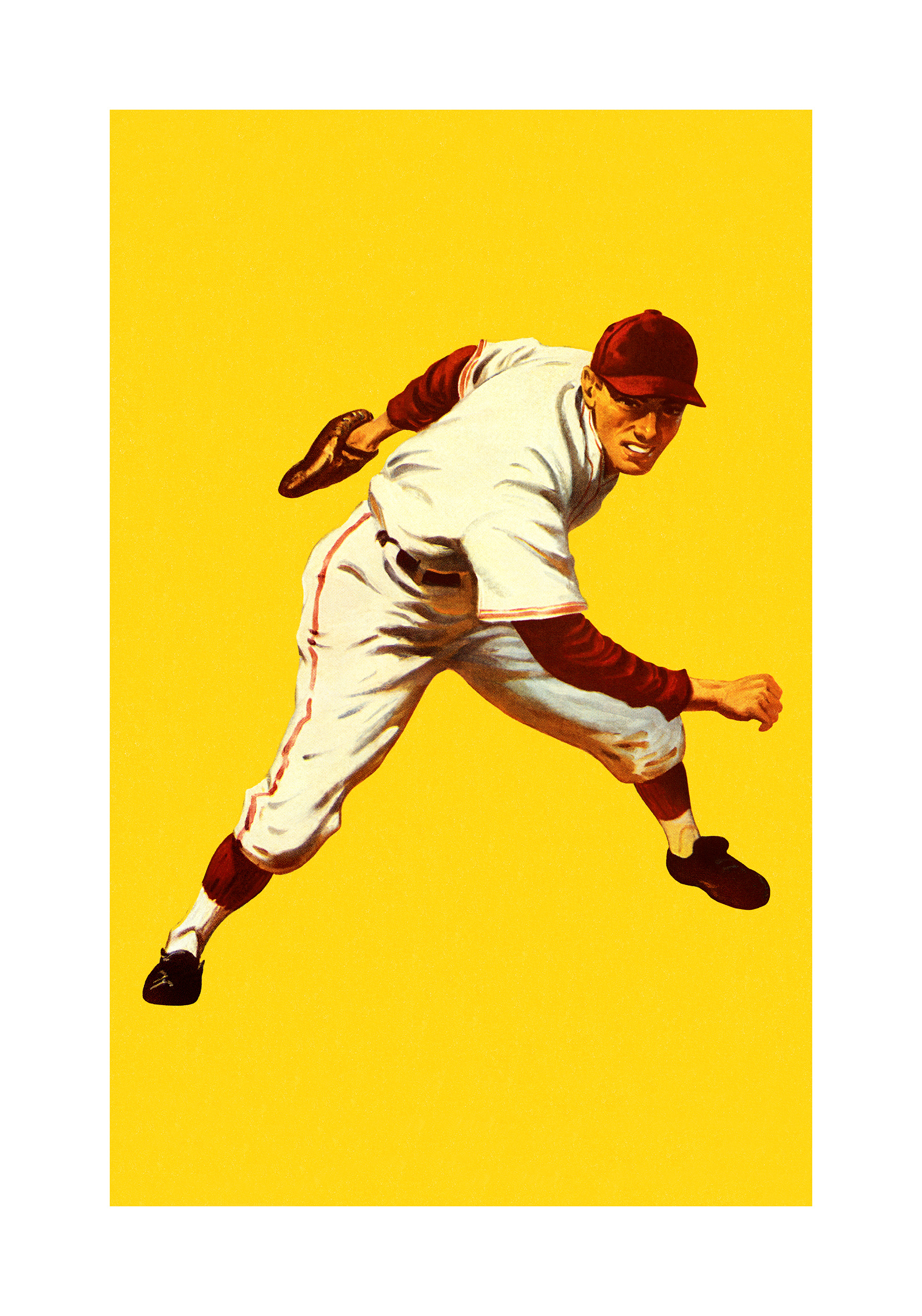 From $15.57A print of a baseball player in a white uniform with red details and a red cap. The player is in a pitching pose against a bright yellow background. Vintage illustration style.