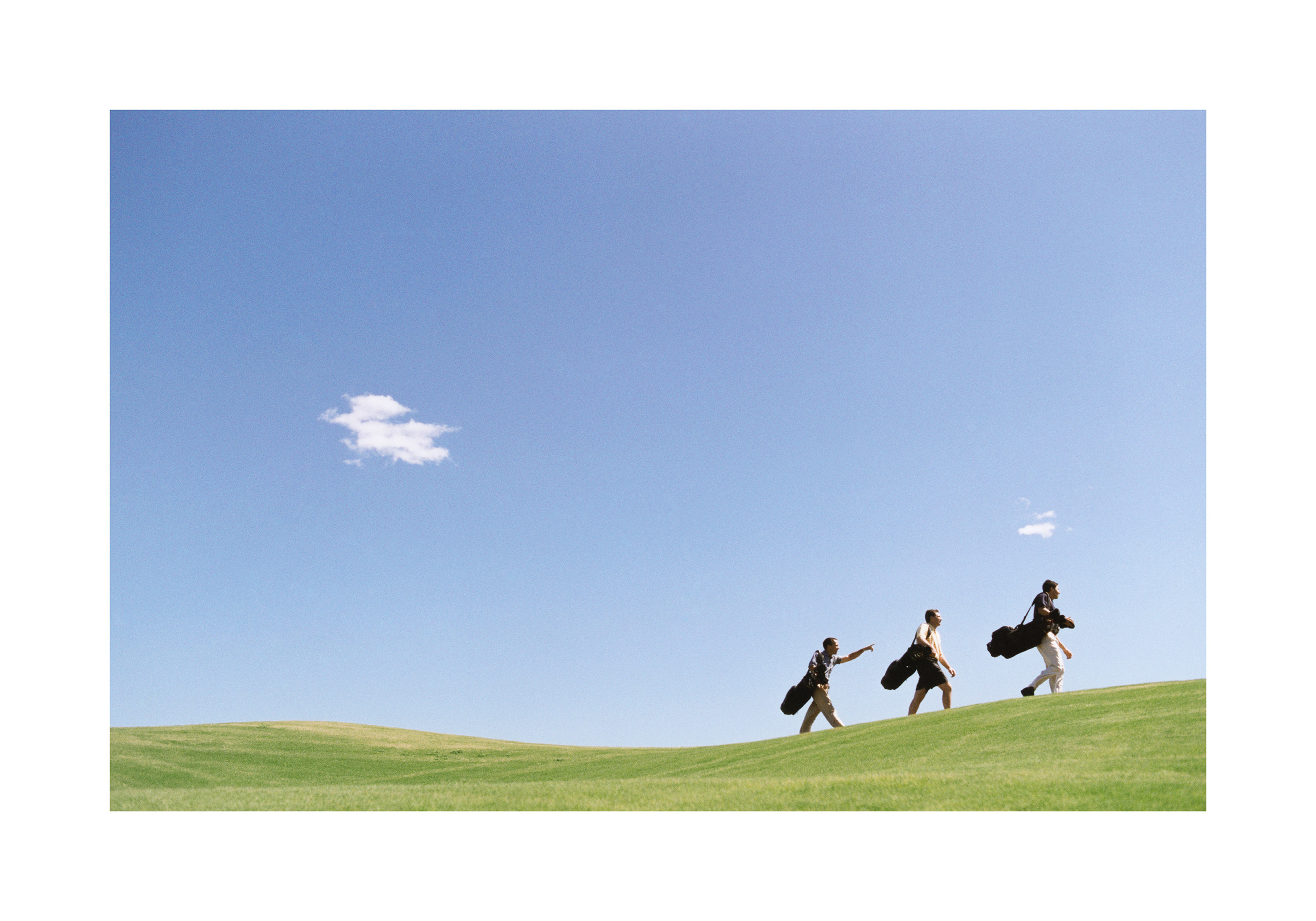 A print of three people walking on a grassy hill with golf bags against a clear blue sky. Perfect wall art for golf lovers.