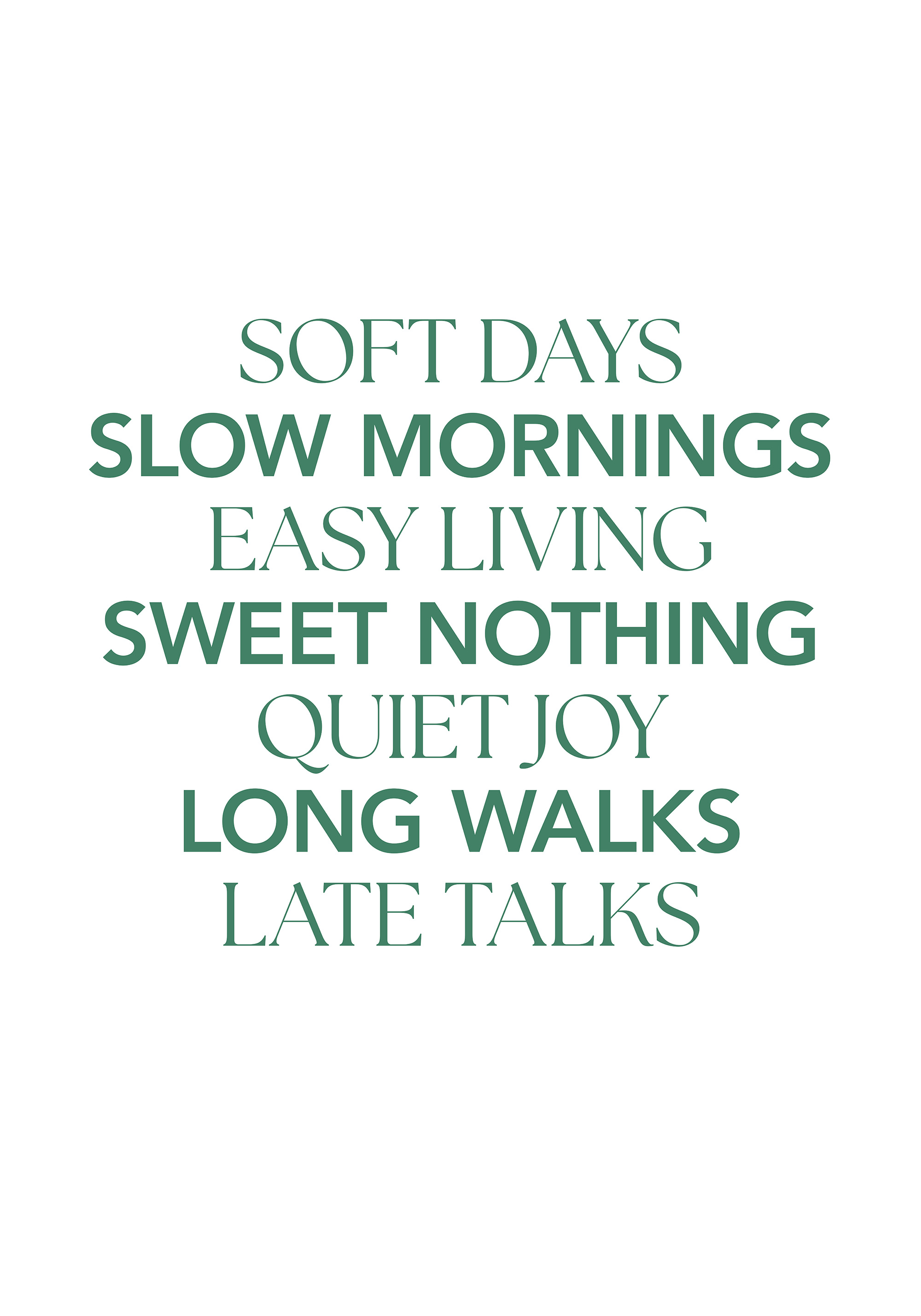 From $15.57A print with green text on a white background featuring the words "Soft Days," "Slow Mornings," "Easy Living," "Sweet Nothing," "Quiet Joy," "Long Walks," and "Late Talks."