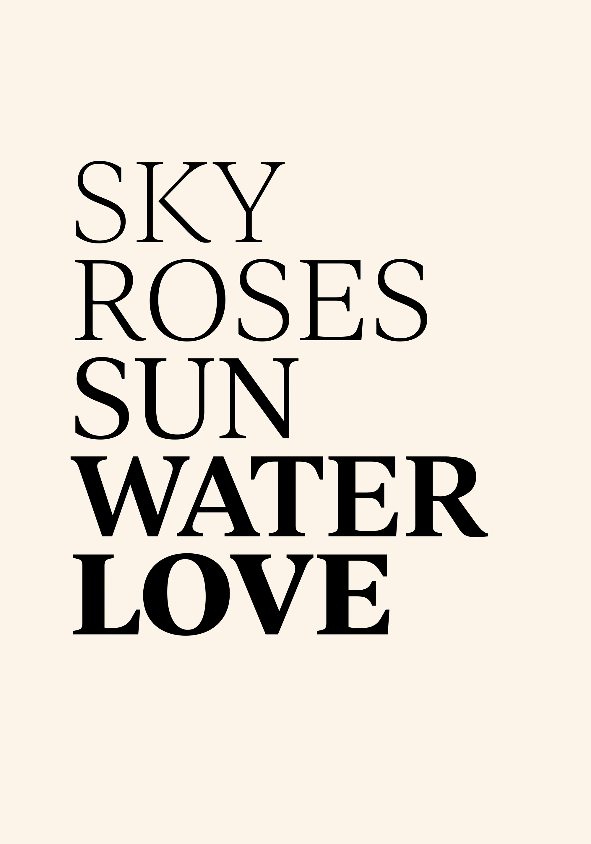 From $15.57A simple print with the words "Sky", "Roses", "Sun", "Water", and "Love" in bold black letters on a beige background. Perfect wall art for your home.
