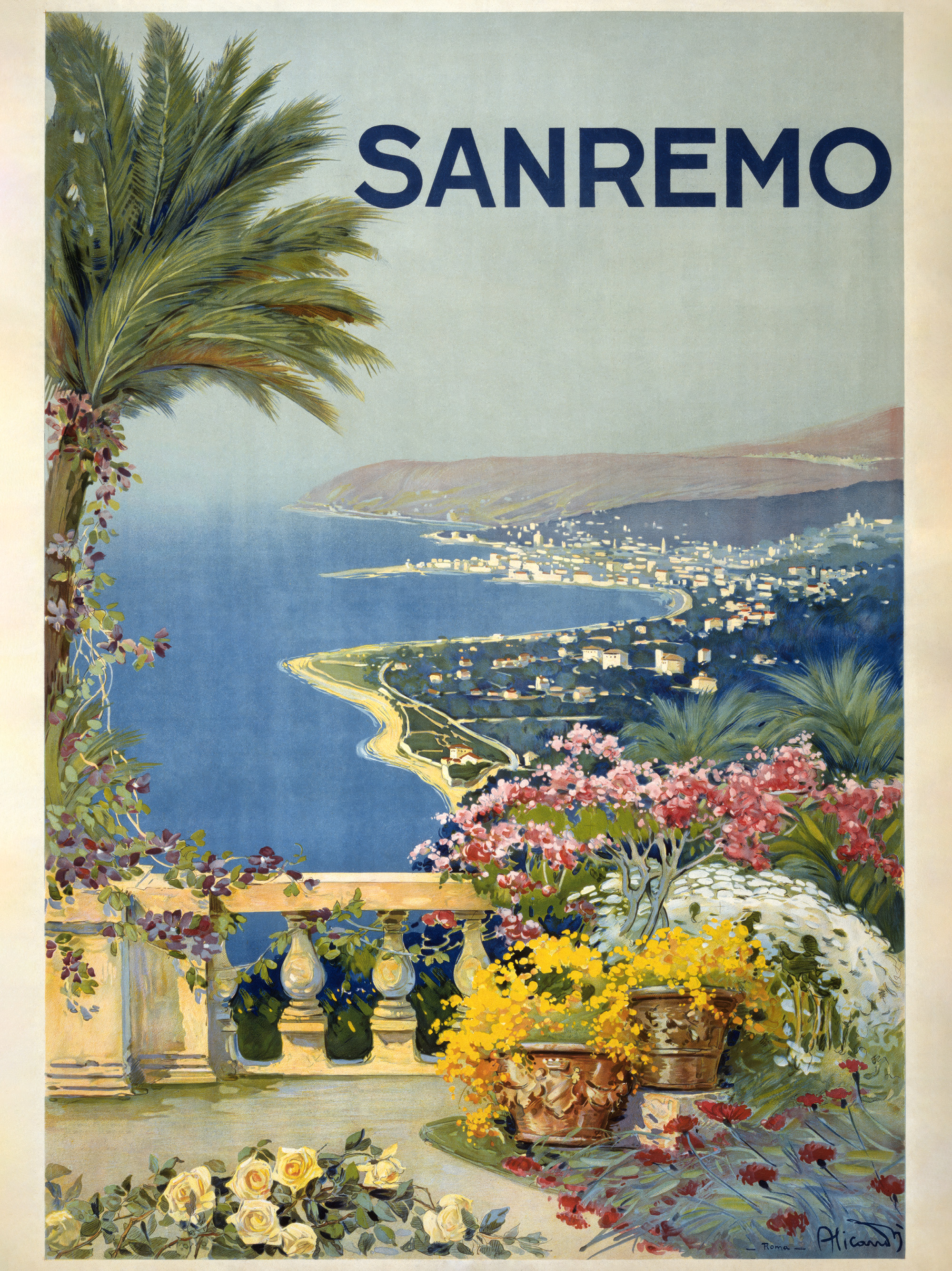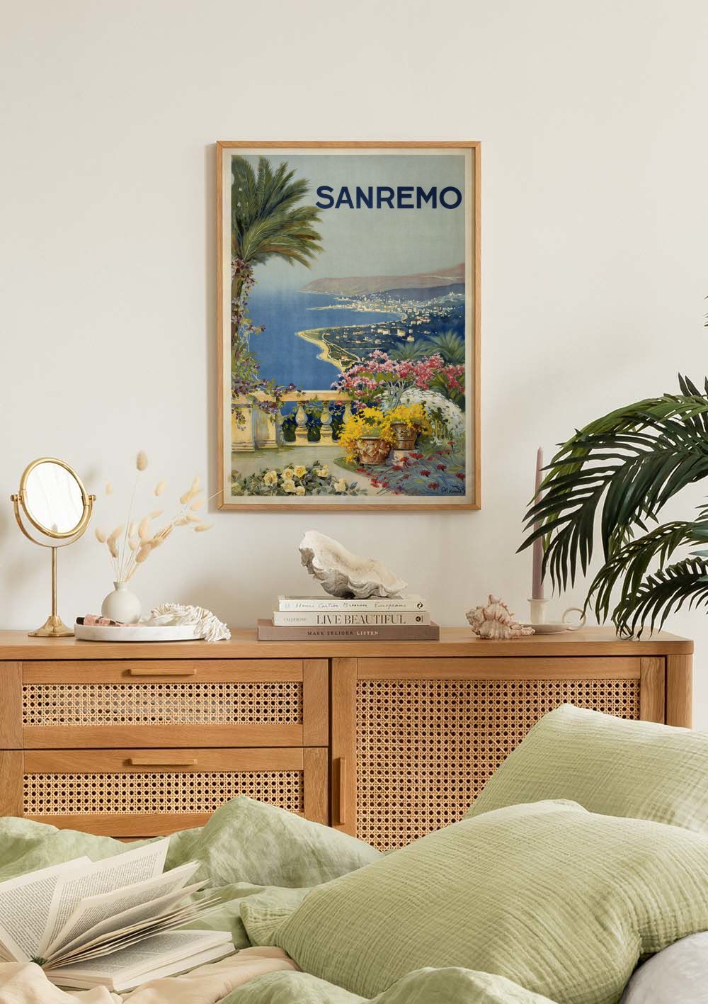 From $15.57A print of the Italian Riviera with a terrace overlooking the blue sea and coastline. Features colourful flowers in yellow, pink, and white, a palm tree, and the text "Sanremo" at the top.