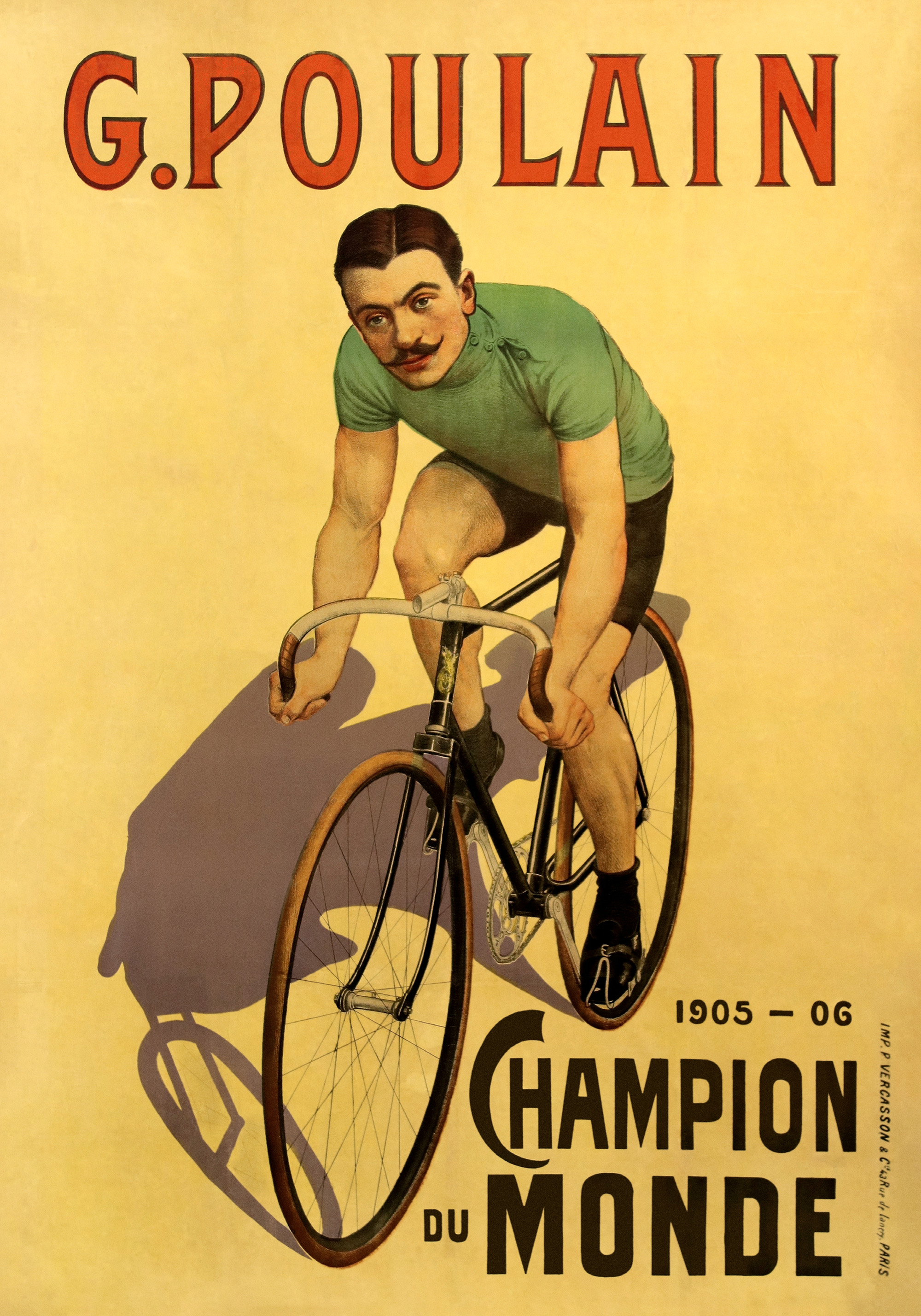 A vintage print of a cyclist in a green shirt and black shorts on a yellow background. The print features red text reading "G. POULAIN" and "1905-06 Champion du Monde".