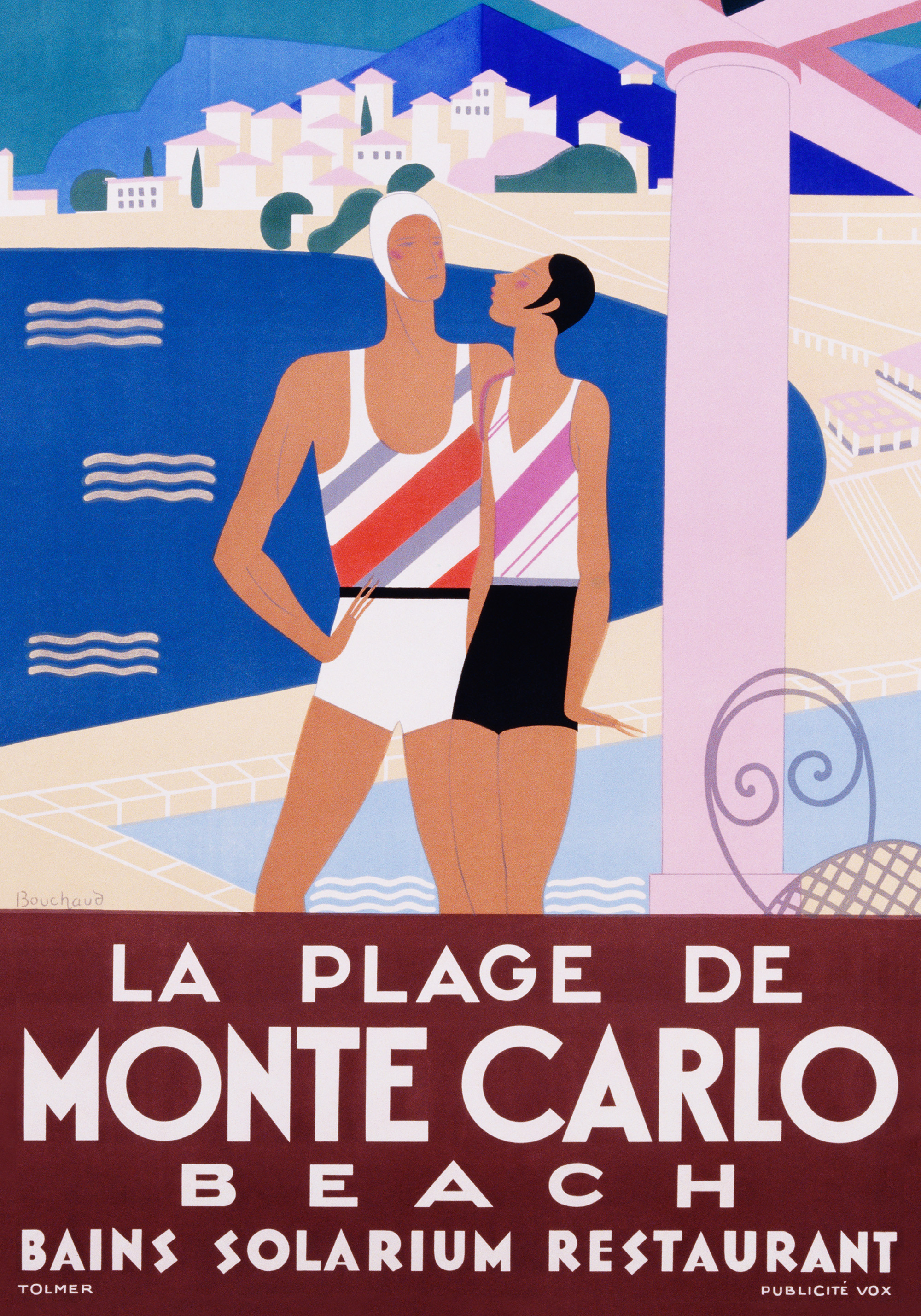 A colourful retro print of two people in striped swimsuits by the seaside in Monte Carlo. Perfect wall art for summer vibes!