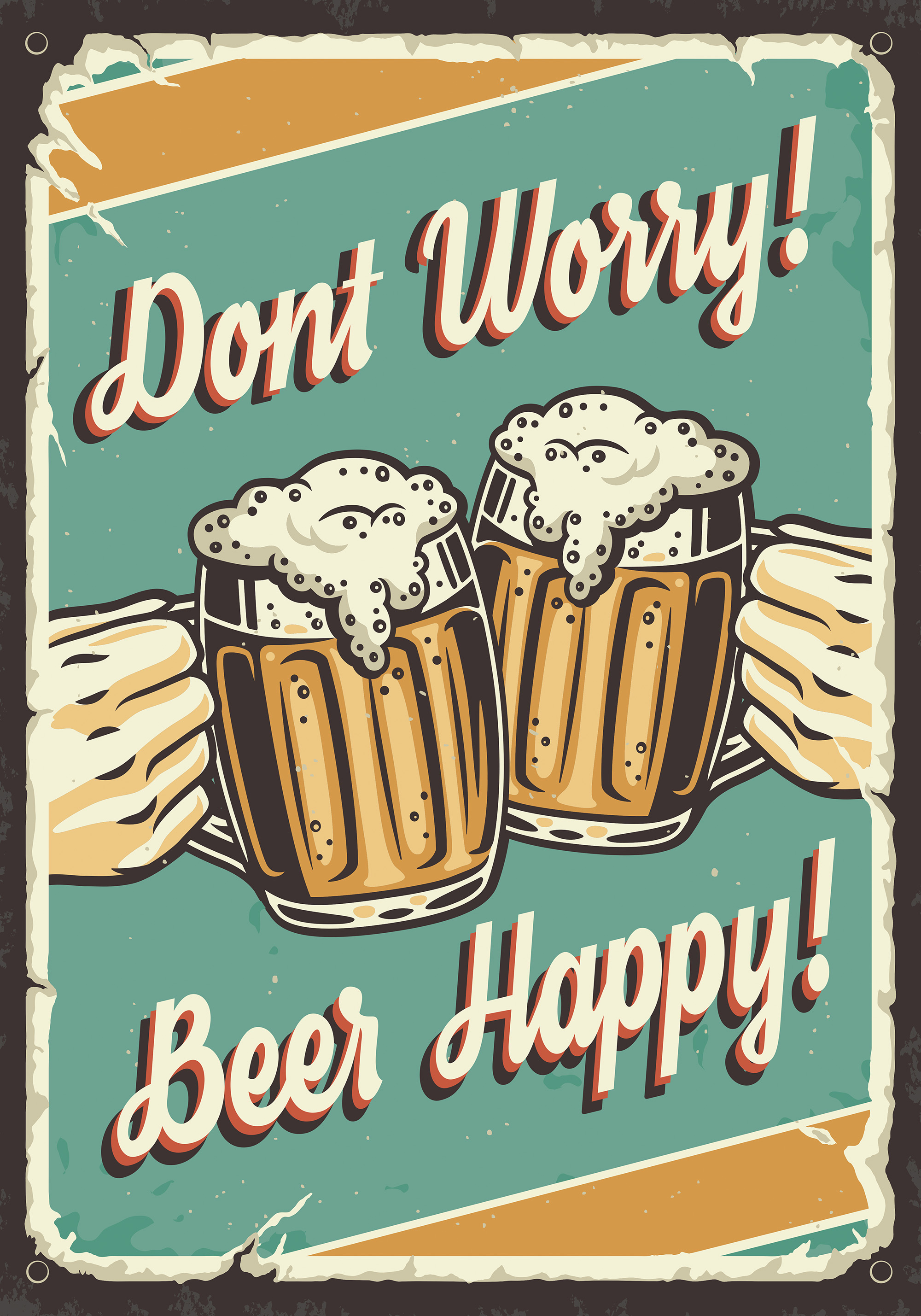 A retro print of two hands holding beer mugs with foam on top. The text says "Don't Worry! Beer Happy!" in red and white letters on a teal background with warm orange and cream details.