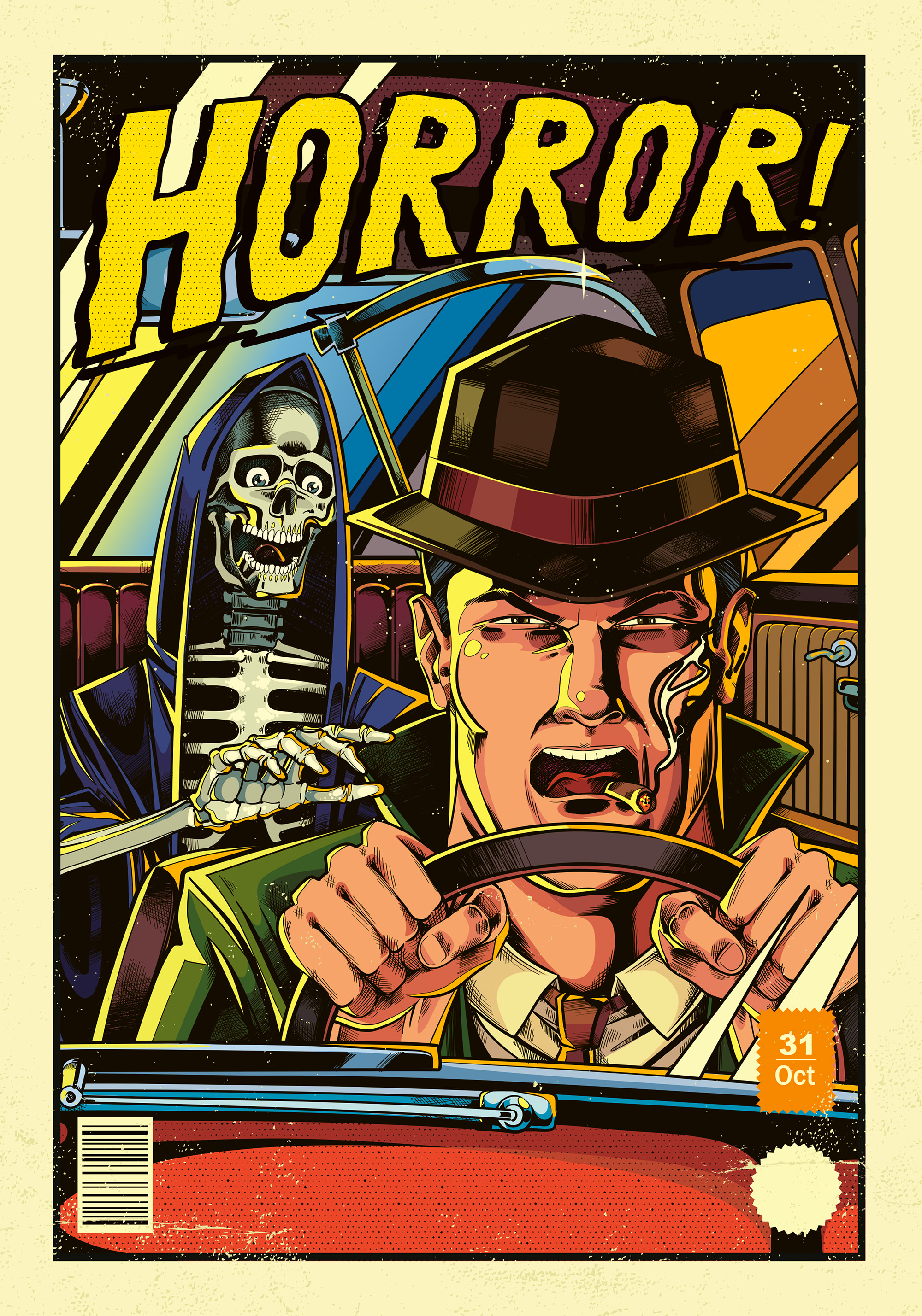 A retro horror print with a man gripping a steering wheel and a skeleton holding a scythe behind him. Illustrated in a comic-like style with bold colours like yellow, blue, and red.