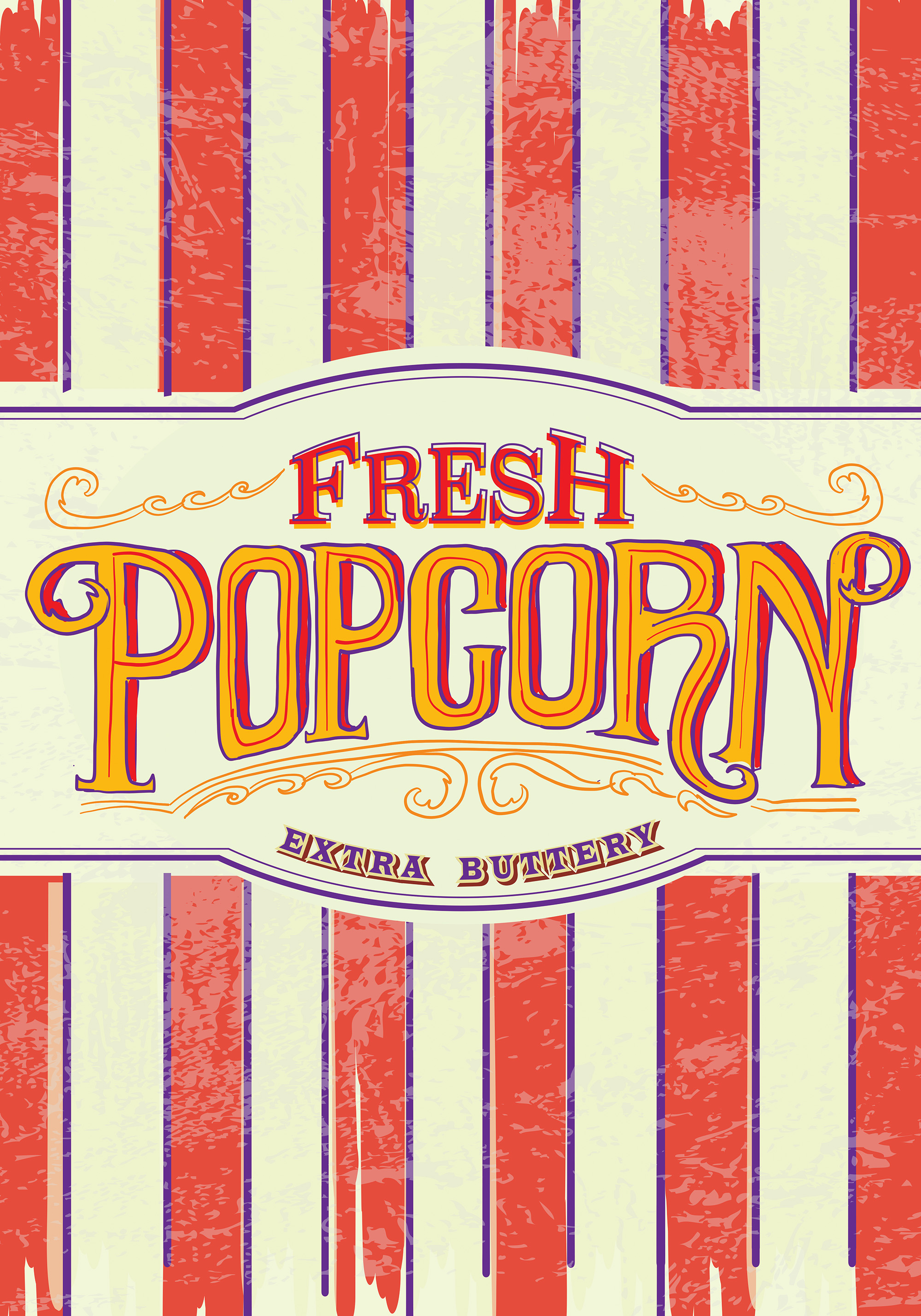 A retro print with bold red and yellow lettering saying "Fresh Popcorn" on a red and white striped background. Perfect wall art for your kitchen!