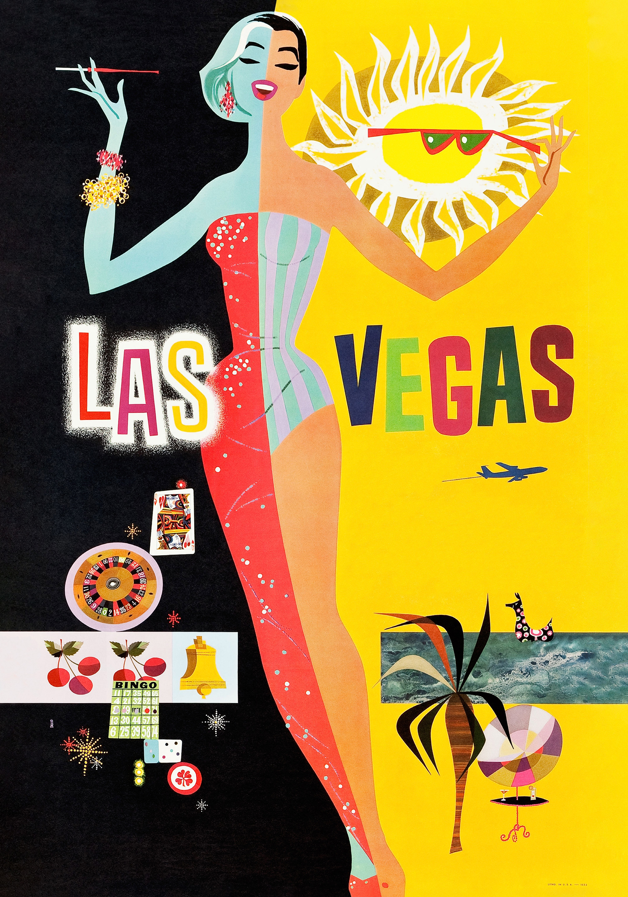 A colourful print with "LAS VEGAS" in bold letters. Featuring a roulette wheel, playing cards, cherries, and a cocktail glass on a black and yellow background.