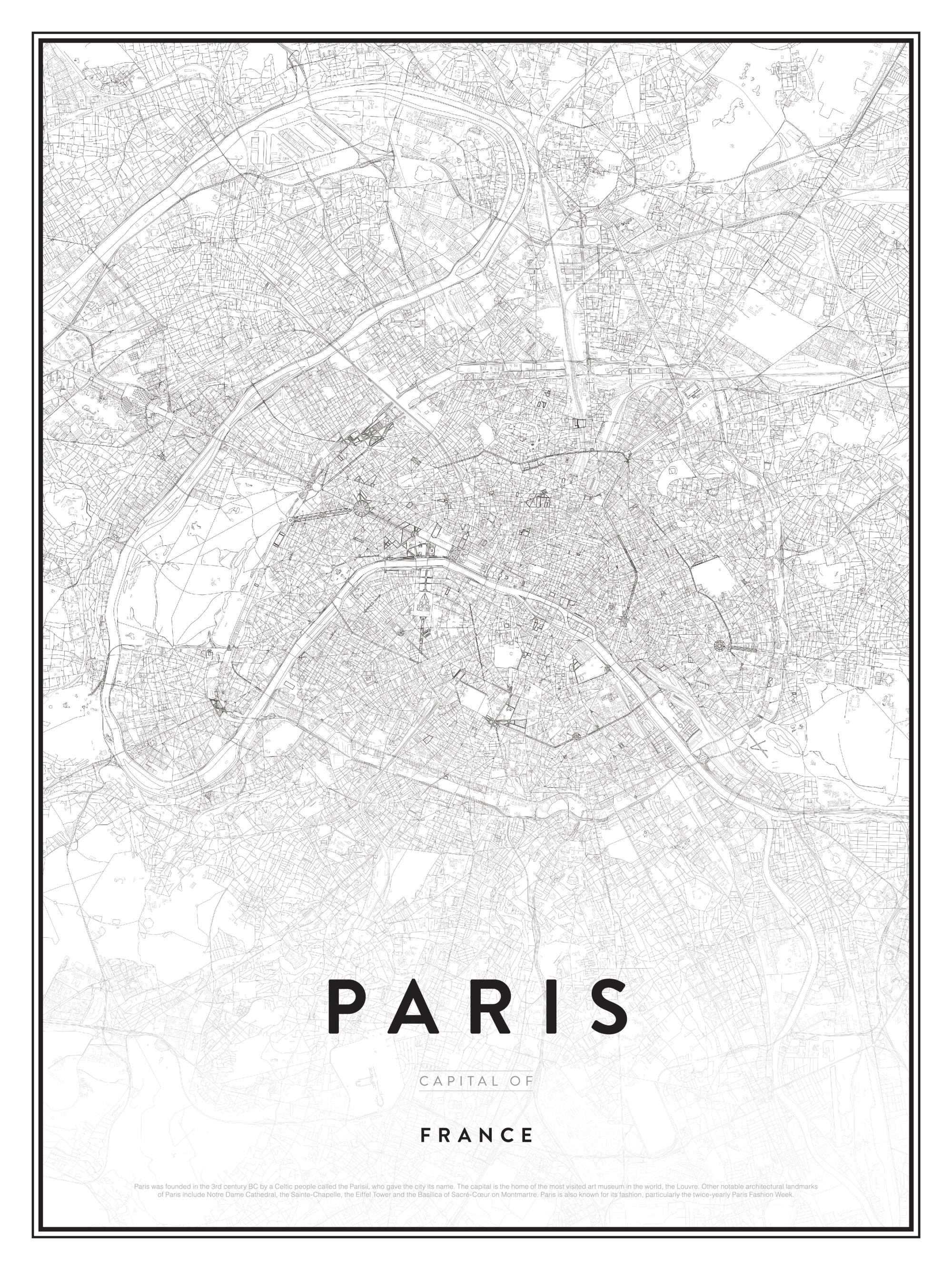 Poster alb-negru cu harta Parisului, considerat orașul iubirii.